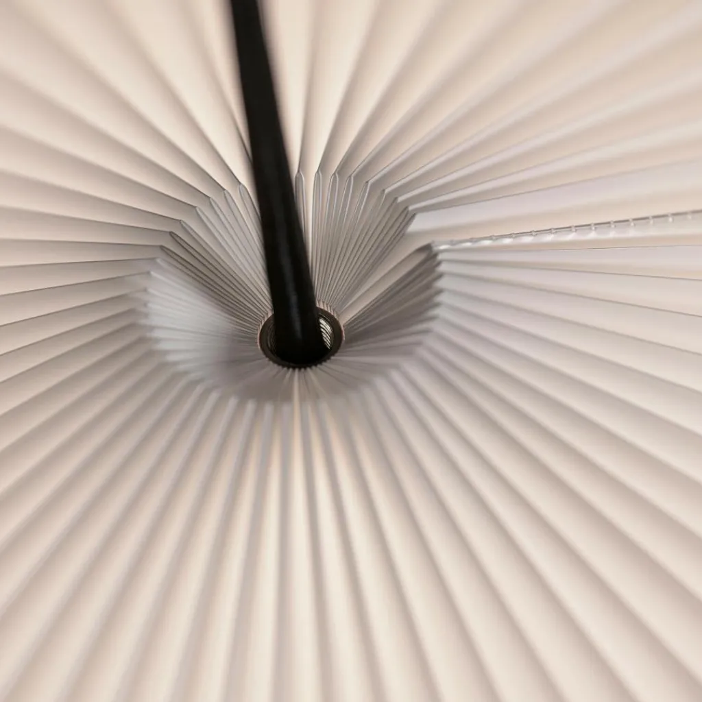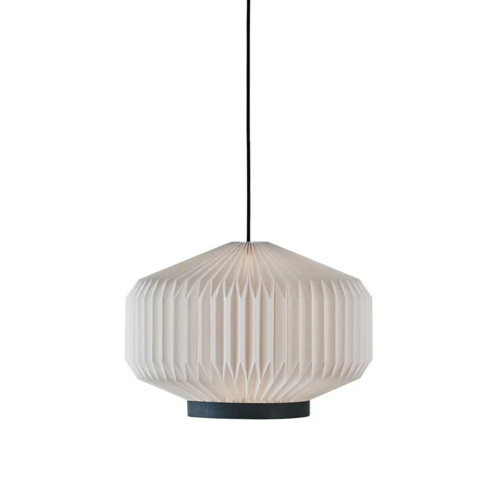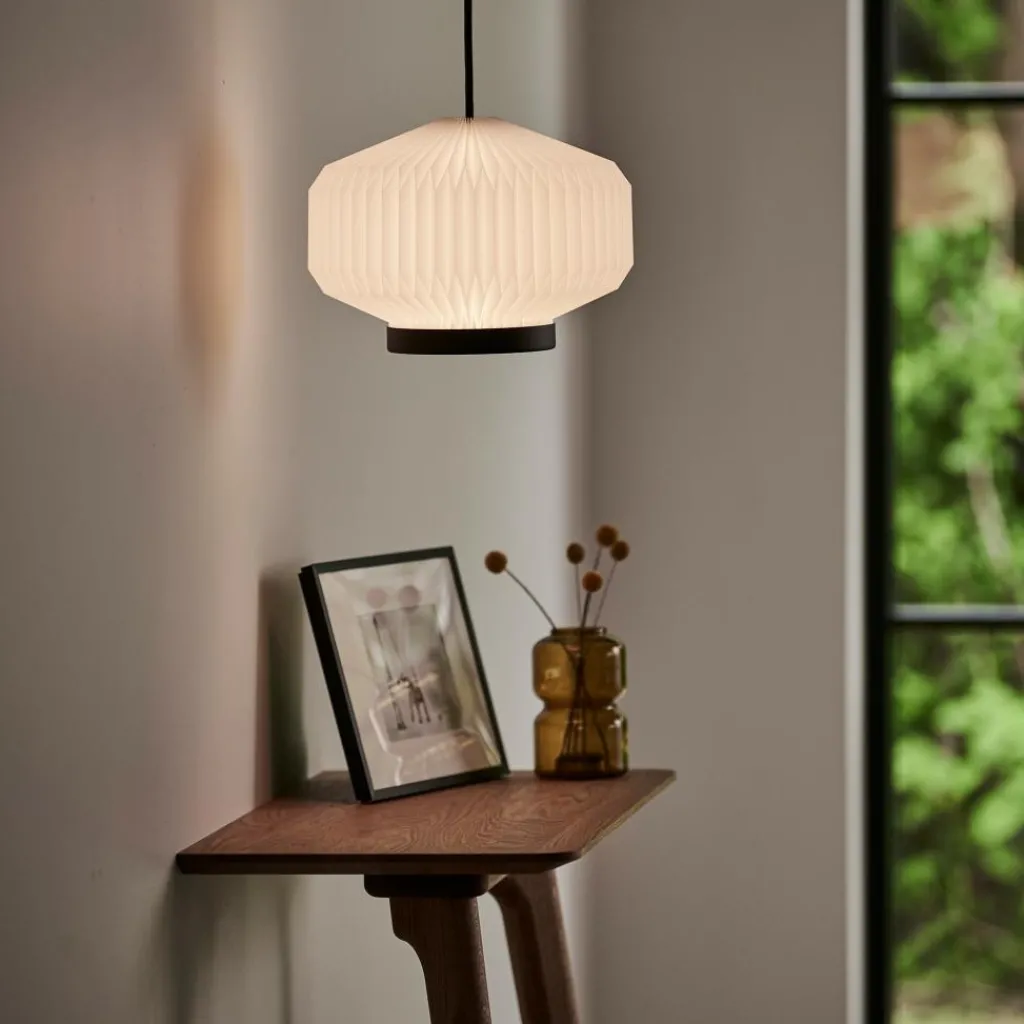 Klar definierte Linien und ein wenig Old-School-Charme schwingen bei der Shibui 186 Pendelleuchte mit. Sie besteht aus einem Schirm aus Kunststoff, der kunstvoll in Falten gelegt ist. Die runde Öffnung an der Unterseite ist mit einem Ring aus Stahl eingefasst. Das Licht dringt diffus durch den Leuchtenschirm und wird direkt durch die Öffnung nach unten weitergeleitet. Mit ihrem minimalistischen Design passt die Shibui 186 Pendelleuchte in jedes Umfeld: Sie eignet sich für das Büro, das private Wohn- und Esszimmer, für Restaurants und weitere Räume.