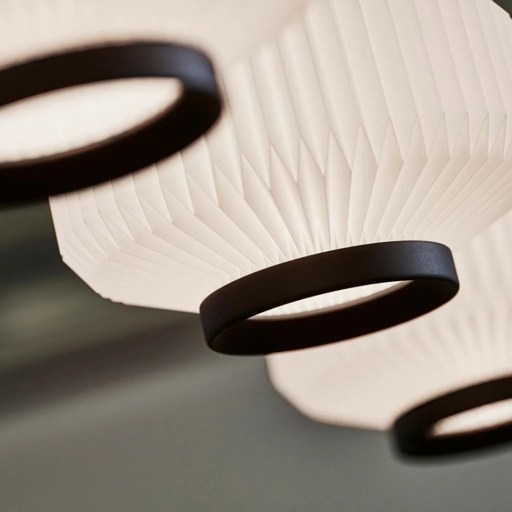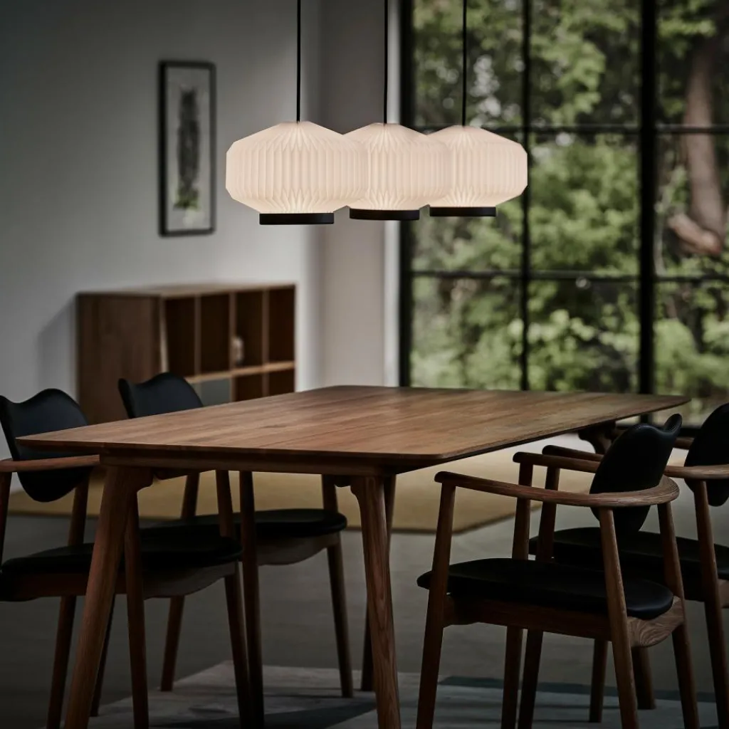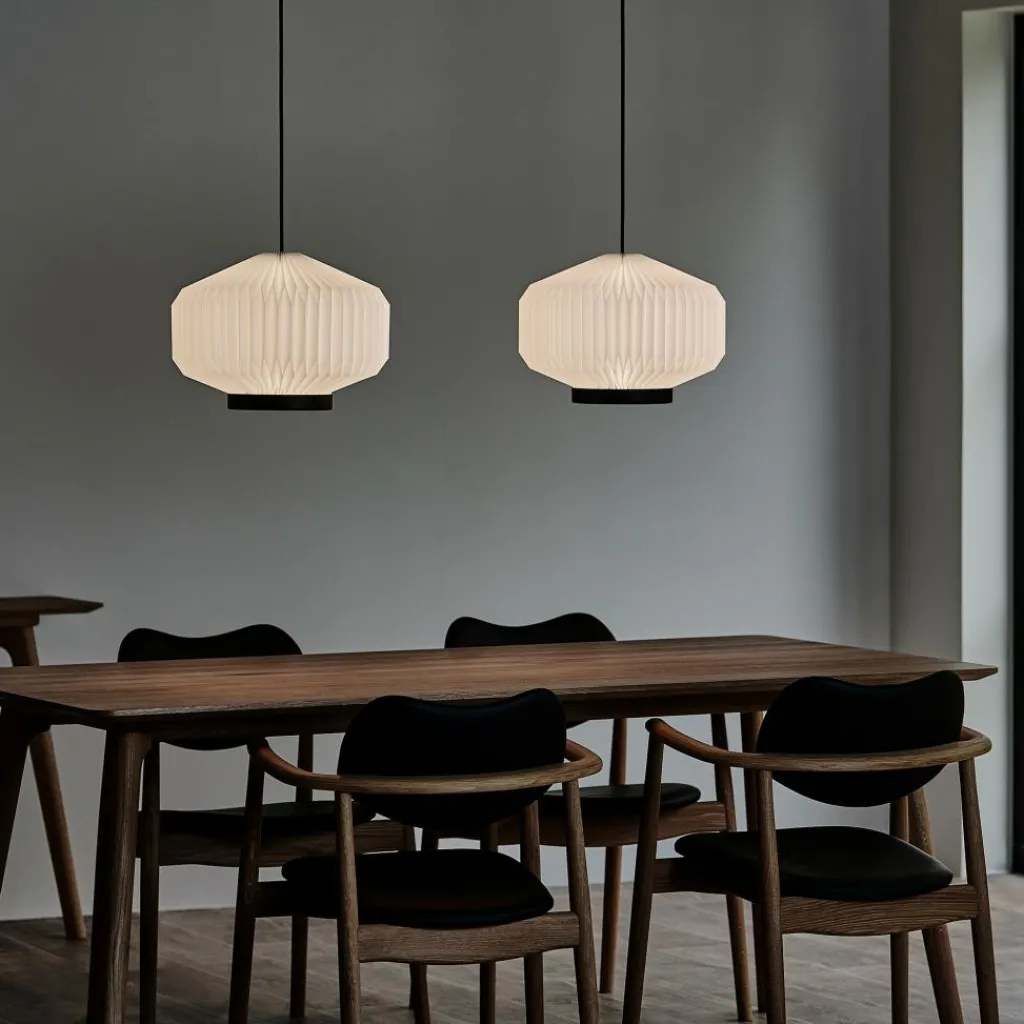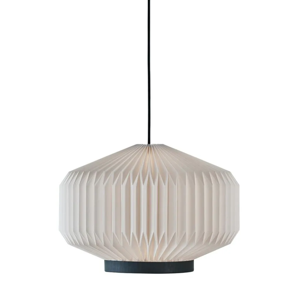 Klar definierte Linien und ein wenig Old-School-Charme schwingen bei der Shibui 186 Pendelleuchte mit. Sie besteht aus einem Schirm aus Kunststoff, der kunstvoll in Falten gelegt ist. Die runde Öffnung an der Unterseite ist mit einem Ring aus Stahl eingefasst. Das Licht dringt diffus durch den Leuchtenschirm und wird direkt durch die Öffnung nach unten weitergeleitet. Mit ihrem minimalistischen Design passt die Shibui 186 Pendelleuchte in jedes Umfeld: Sie eignet sich für das Büro, das private Wohn- und Esszimmer, für Restaurants und weitere Räume.