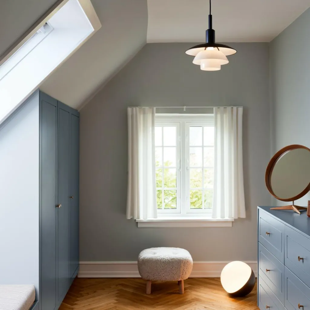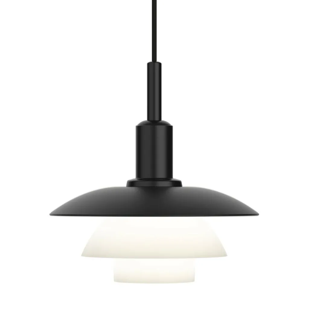 Das formale Design aller PH 3/3 Pendelleuchten stützt sich auf eine mathematische Formel. Demnach wird ein diffuses, blendfreies Licht erzeugt, wenn die drei Schirme über dem Leuchtmittel im Verhältnis 3:2:1 angeordnet werden. Die PH 3/3 Pendelleuchte Opalglas und Metall nützt zudem die unterschiedlichen Materialien ihrer Schirme. Ihre beiden unteren Schirme bestehen aus mundgeblasenem Opalglas, das einen warmen Lichtschein erzeugt, während der oberste und größte Leuchtenschirm aus Metall gefertigt ist. Seine weiß lackierte Innenseite reflektiert das Licht direkt nach unten. Damit ist die PH 3/3 Pendelleuchte Opalglas und Metall perfekt über dem Esstisch, einer Theke oder der Sofalandschaft im Wohnzimmer.