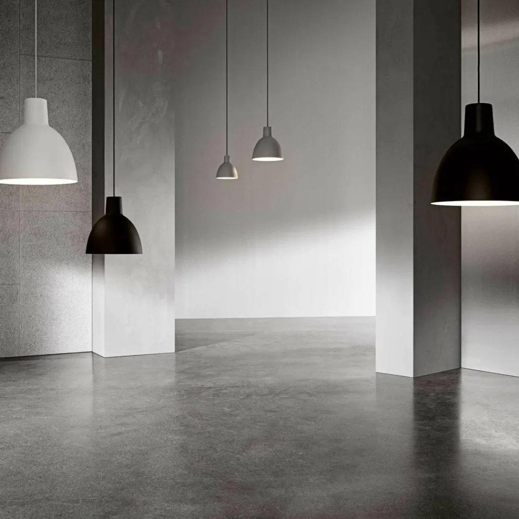 Die Toldbod 250 Pendelleuchte wurde vom Designer Louis Poulsen für die Marke Louis Poulsen entworfen. Die minimalistische Formgebung dieser eleganten, unaufdringlich schlichten Pendelleuchte greift jene vertraute Linienführung auf, die man auch von Leuchten in der Öffentlichkeit oder von gewerblichen Arbeitsplätzen kennt. Der glatte Leuchtenschirm zeigt keine unnötig dekorativen Elemente und begeistert durch seine harmonischen Proportionen. Der sehr schlanke, obere Teil dient zur Aufnahme des Leuchtmittel. Der Leuchtenkörper öffnet sich im weiteren Verlauf zu einer elliptischen, an eine Halbkugel erinnernden Glocke, durch die das Licht konzentriert gebündelt wird. Durch diese charakteristische Form erzeugt die Toldbod 250 Pendelleuchte eine gleichmäßige Beleuchtung ohne jede Blendung. Die innere Fläche des Leuchtenschirms ist bei allen äußeren Farbgebungen immer matt weiß und gewährleistet dadurch eine gleichmäßige Abstrahlung des Lichtes.