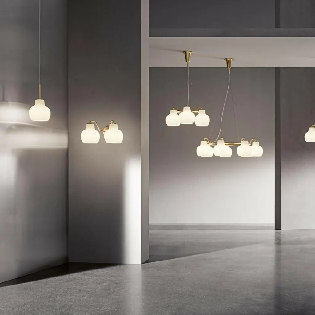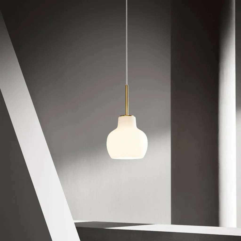 Die VL Ring Crown 1 Pendelleuchte überzeugt durch ihr ebenso unaufdringliches wie elegantes Design. Sie wird dominiert von dem mundgeblasenen weißen Opalglas des geschlossenen Lampenschirms, welcher durch das glänzende Messing der Halterung so richtig zur Geltung kommt. Die Lampe ist 34,2 cm hoch und hat einen Durchmesser von 19 cm und kann aufgrund des 400 cm langen Kabels in jedem Winkel und auf jeder Höhe angebracht werden. Die gesamte Konstruktion ist mit 1,2 kg leicht genug, um auch an abgehängten Decken befestigt zu werden.
