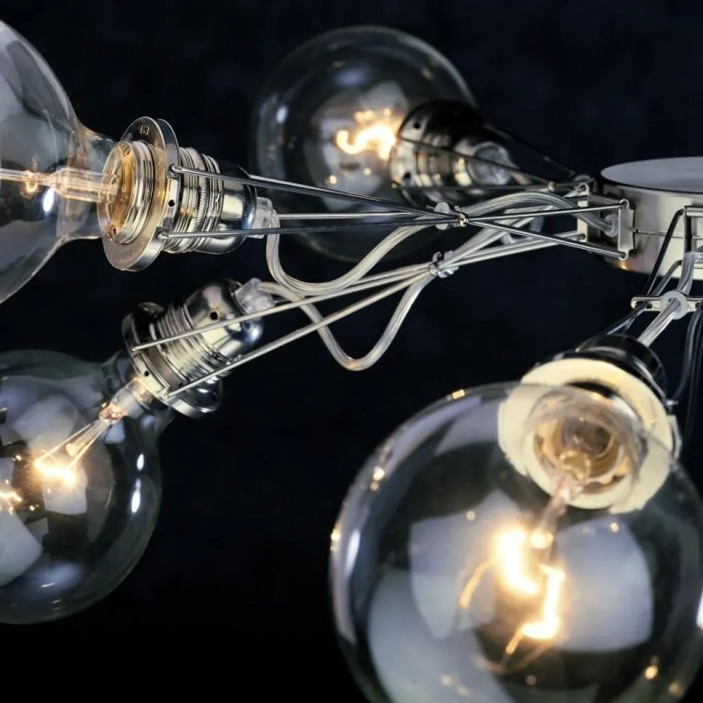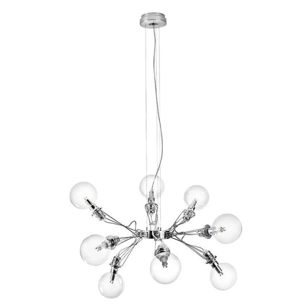 Die Matrix Otto Pendelleuchte wurde von Yaacov Kaufman für die Marke Lumina entworfen. Sie ist eine moderne Interpretation klassischer Kronleuchter: Da sie ohne Leuchtenschirme auskommt, steht das Leuchtmittel im Fokus.