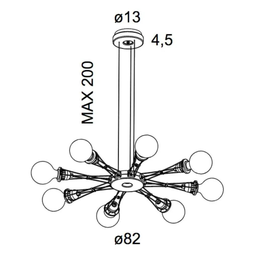 Die maximale Abhängungshöhe der Matrix Otto Pendelleuchte beträgt 200 cm, wobei die dünnen Seile an der Deckenrosette gekürzt werden können. Der Baldachin hat einen Durchmesser von 13 cm. Die 82 cm breiten Leuchte benötigt acht Leuchtmittel mit E27-Fassungen.