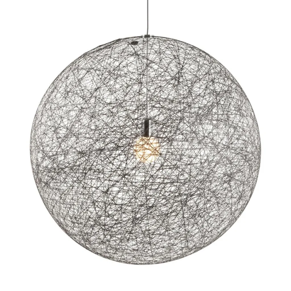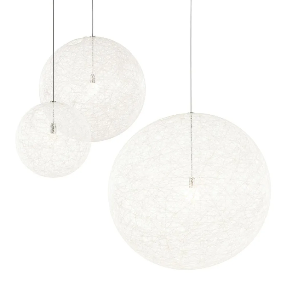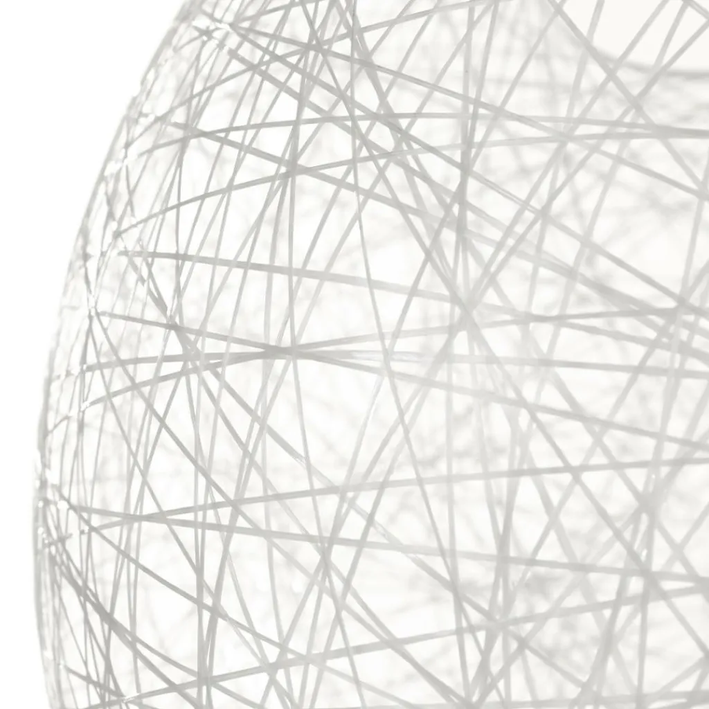 Wie von Pot gewohnt entsprang auch die Idee für die Random Light II M Pendelleuchte dem Wunsch mit ausgefallen Materialien Licht eine neue Dimension zu geben. Die Fertigung des extravaganten Leuchtenschirms erfolgt in mehreren Schritten: Zunächst wird ein Strandball aufgeblasen und dann werden dünne Fäden aus Fiberglas mit Epoxidglas benetzt. Diese Streifen werden nun um den Ball gewickelt. Nach völliger Austrocknung wird die Luft aus dem Ball gelassen und der Ball entfernt. So entsteht der wie zufällig – auf englisch random – angeordnete Körper, der bei der Random Light II M Pendelleuchte als Leuchtenschirm fungiert.