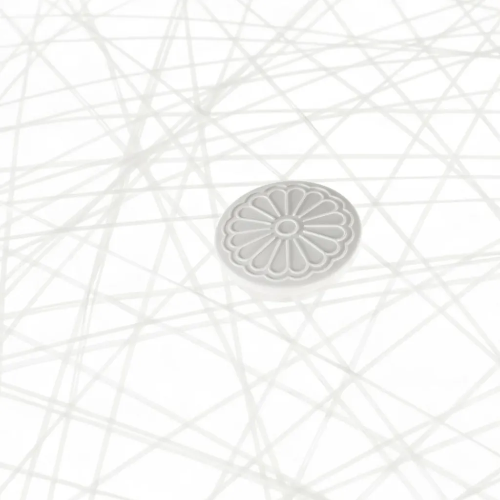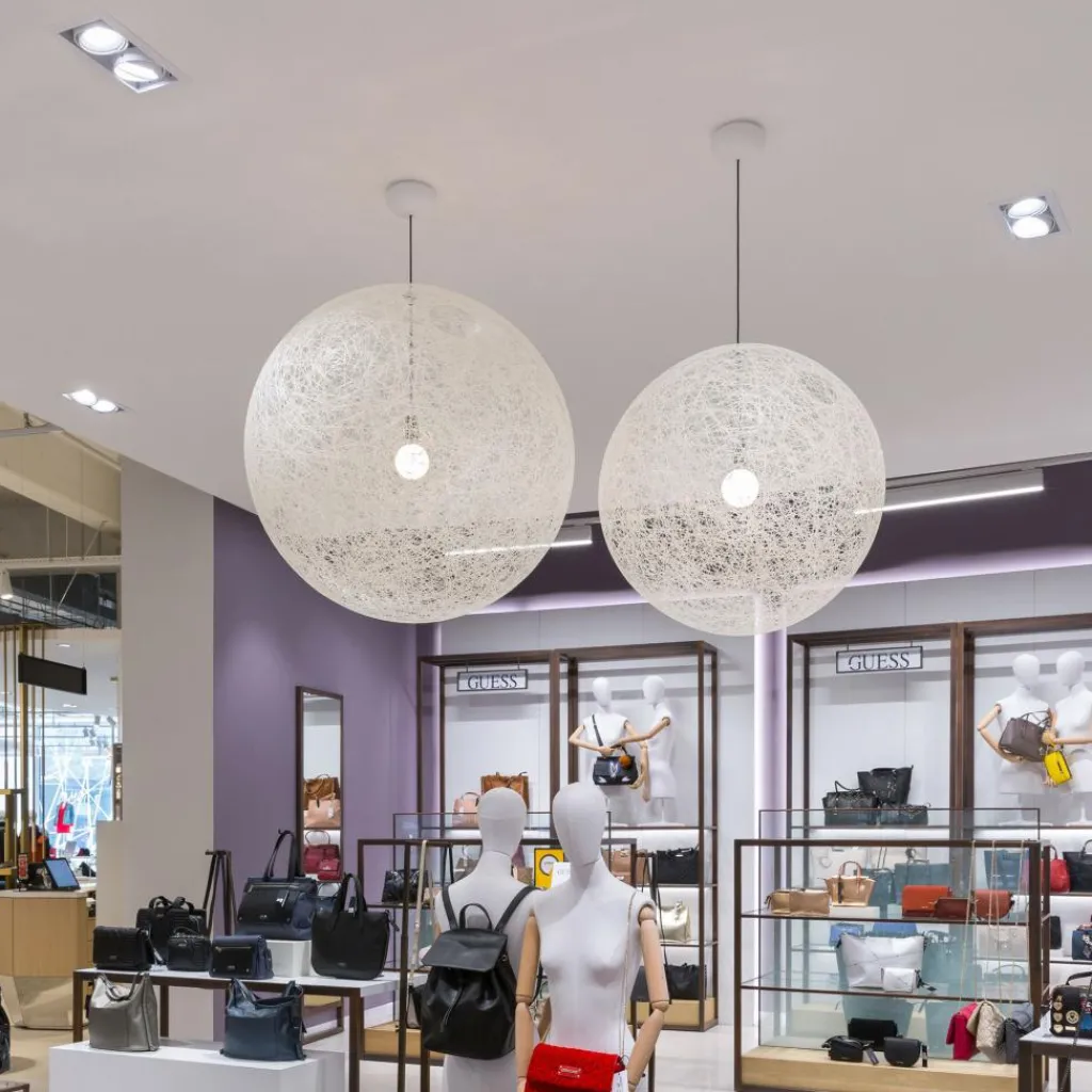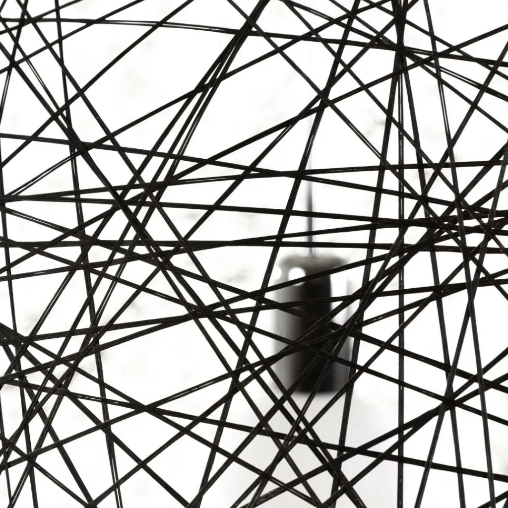 Wie von Pot gewohnt entsprang auch die Idee für die Random Light II M Pendelleuchte dem Wunsch mit ausgefallen Materialien Licht eine neue Dimension zu geben. Die Fertigung des extravaganten Leuchtenschirms erfolgt in mehreren Schritten: Zunächst wird ein Strandball aufgeblasen und dann werden dünne Fäden aus Fiberglas mit Epoxidglas benetzt. Diese Streifen werden nun um den Ball gewickelt. Nach völliger Austrocknung wird die Luft aus dem Ball gelassen und der Ball entfernt. So entsteht der wie zufällig – auf englisch random – angeordnete Körper, der bei der Random Light II M Pendelleuchte als Leuchtenschirm fungiert.