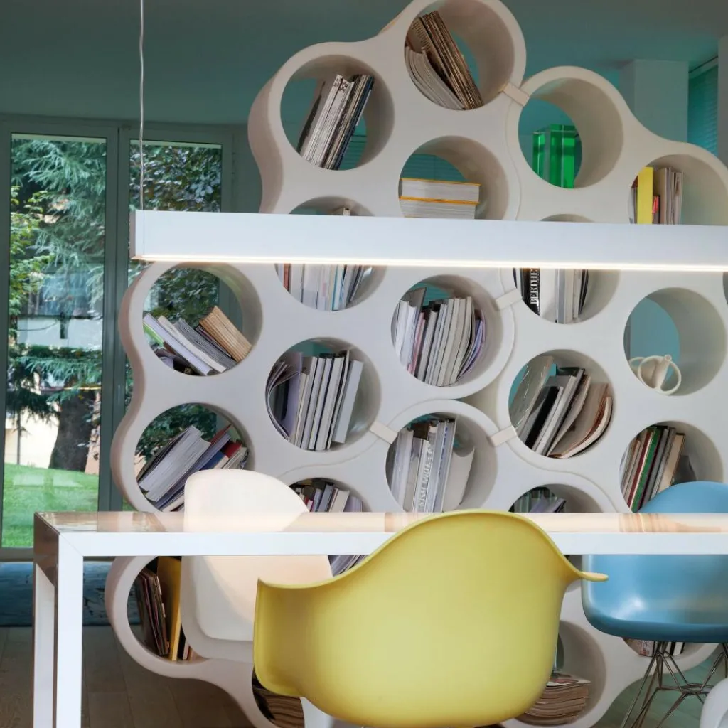 Die matt weiße Struktur des Leuchtenkörpers aus Aluminium und das dezente Seilpendel aus Stahl lassen die Tru Pendelleuchte/Pendellampe förmlich im Raum schweben. Mit 175cm Länge macht sich die Design-Hängeleuchte von Nemo hervorragend über einem großen Esszimmer-Tisch oder zur Beleuchtung eines Meetingsraums im Büro.
