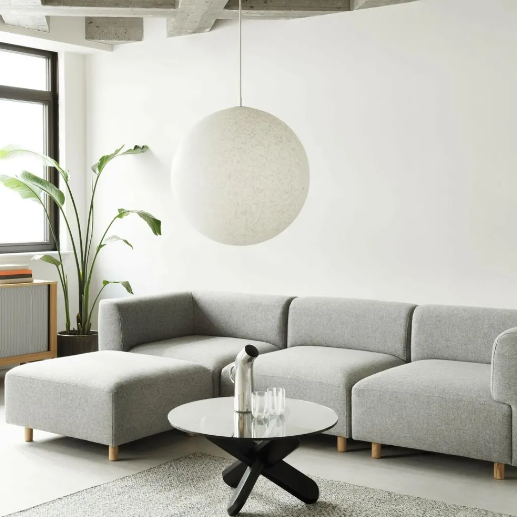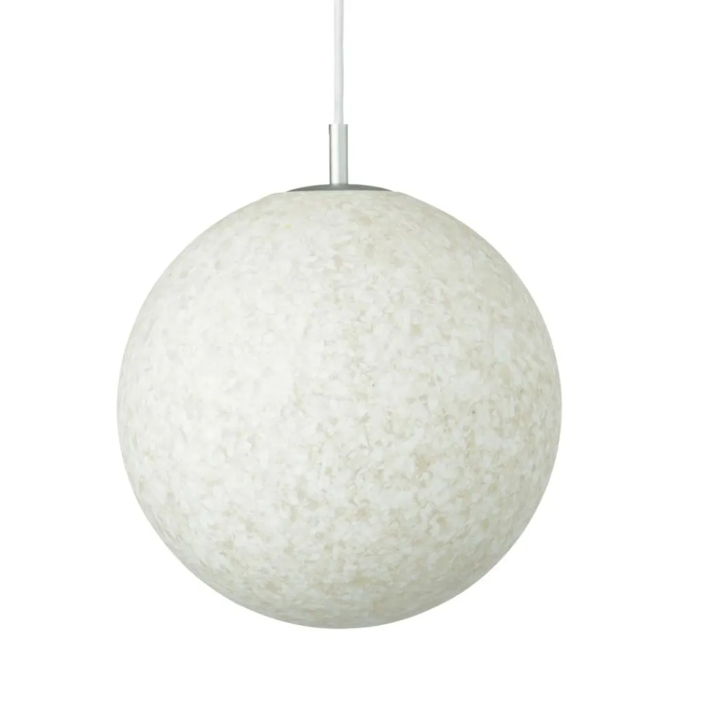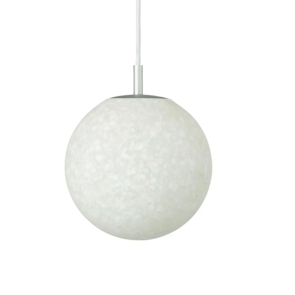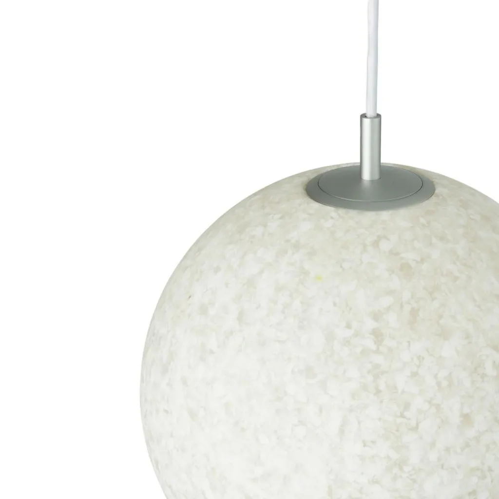 Die Pix Pendelleuchte ist ein perfektes Beispiel dafür, wie stilvoll nachhaltige Einrichtungsgegenstände aussehen können. Der Leuchtenschirm wird aus recyceltem Plastik gemacht. So trägt die Pix Pendelleuchte dazu bei, Müllberge zu reduzieren. Der Designer verwendet Abfall in verschiedenen Farbtönen, die granuliert und gemischt werden. So entstehen eine spezielle Textur und auffallende Sprenkel. Selbst wenn die Pix Pendelleuchte nicht eingeschaltet ist, wirkt sie dekorativ. Kaum betätigt man den Schalter, spendet sie sphärisches Licht in alle Richtungen. Ein wenig erinnert die Pix Pendelleuchte mit ihrer kugelrunden Form an den Mond. Die Deckenbefestigung wird aus Stahl gemacht. Mit einem Stab aus Aluminium ist das Kabel mit dem Leuchtenschirm verbunden.