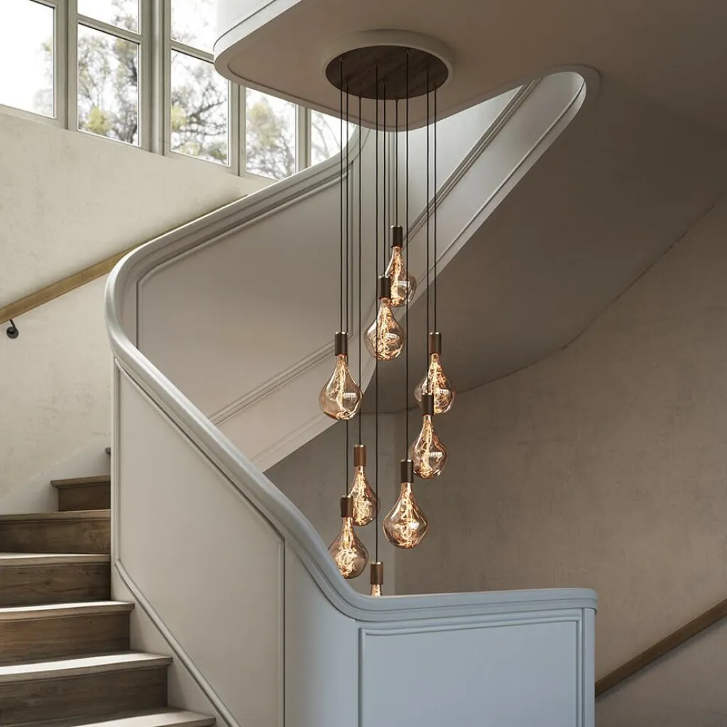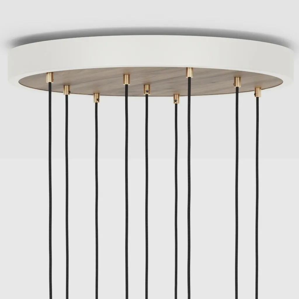 Das 500 cm lange Kabel lässt Flexibilität bei der Aufhängung der neun Leuchtmittel zu. Die extern dimmbare Walnut Nine Pendant with Voronoi II Pendelleuchte wird an einer Rosette mit einem Durchmesser von 50,8 cm an der Decke fixiert. Filigran sind hingegen die Halterungen für die Leuchtmittel mit einem Durchmesser von 5 cm.