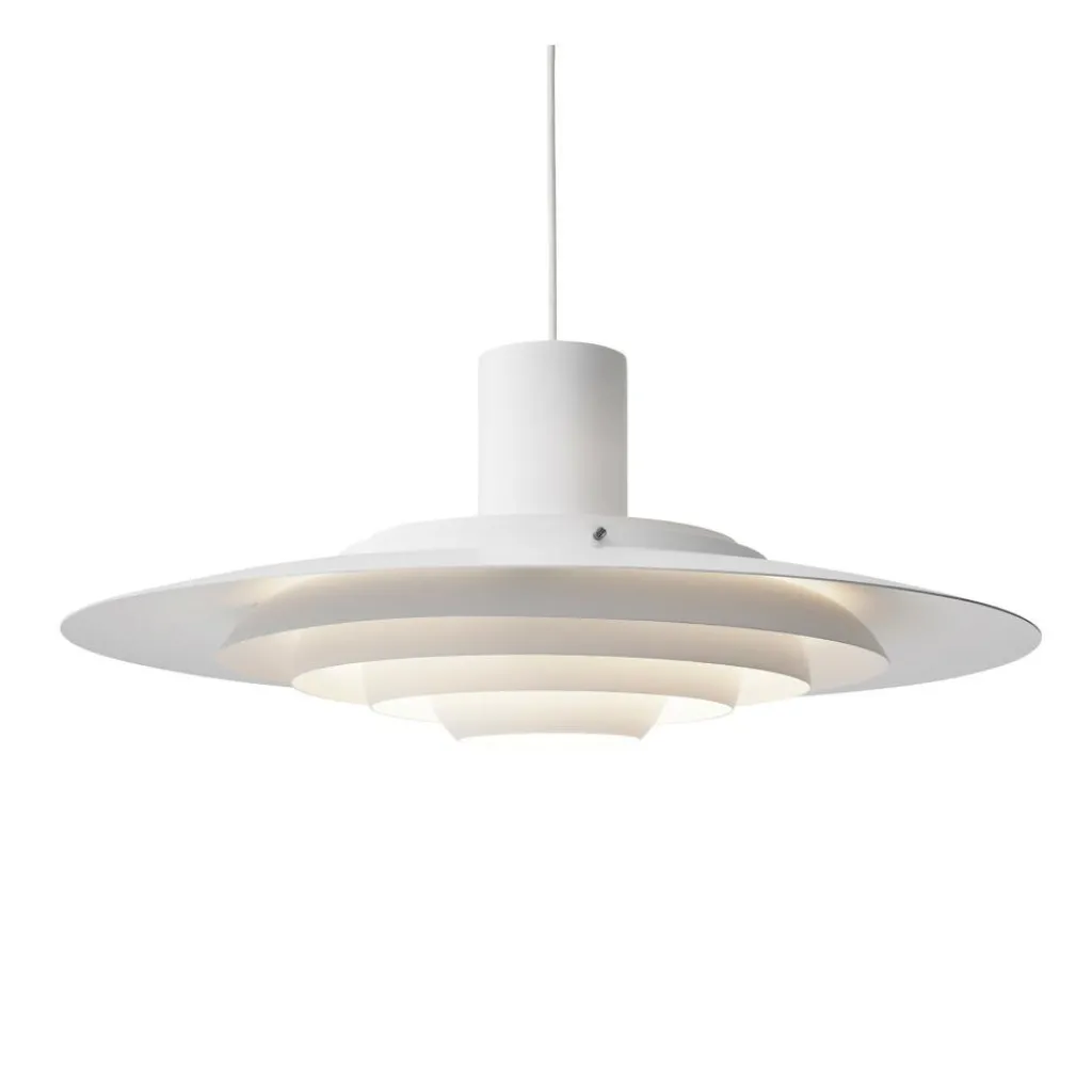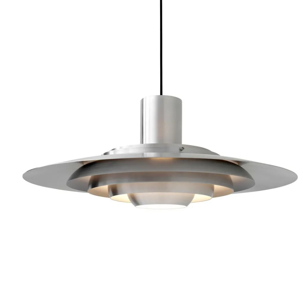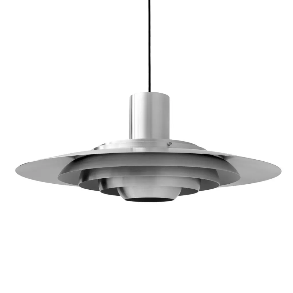 Die aus Aluminium gefertigte P376 KF2 Pendelleuchte wurde 1963 dem designaffinen Publikum vorgestellt. Das klassische Design wurde von dem in den 1960er-Jahren dominierenden Futurismus inspiriert und erinnert mit den fünf konzentrisch verlaufenden Bauteilen an die Silhouette eines unbekannten Flugobjekts. Aber auch rein praktisch betrachtet hat diese Bauart einen bestimmten Zweck: Die Neigung und die unterschiedliche Höhe der konzentrischen Kreise verteilt das Licht der nicht in der Lieferung enthaltenen Leuchtmittels diffus in der Umgebung und erschafft eine absolut blendfreie Atmosphäre. Sowohl als Primärbeleuchtung eines Raumes als auch als punktuelle Lichtquelle über dem Esstisch macht die Pendelleuchte eine souveräne Figur.