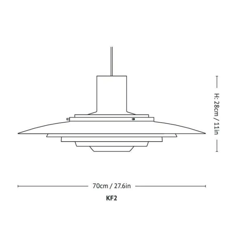 Die P376 KF2 Pendelleuchte besitzt eine Höhe von 28cm und einen beeindruckenden Durchmesser von 70cm. Die Kabellänge beträgt 600cm, was das Aufhängen in hohen Räumen problemlos möglich macht. Ein Leuchtmittel für die E27-Fassung kann unter Zubehör mitbestellt werden.