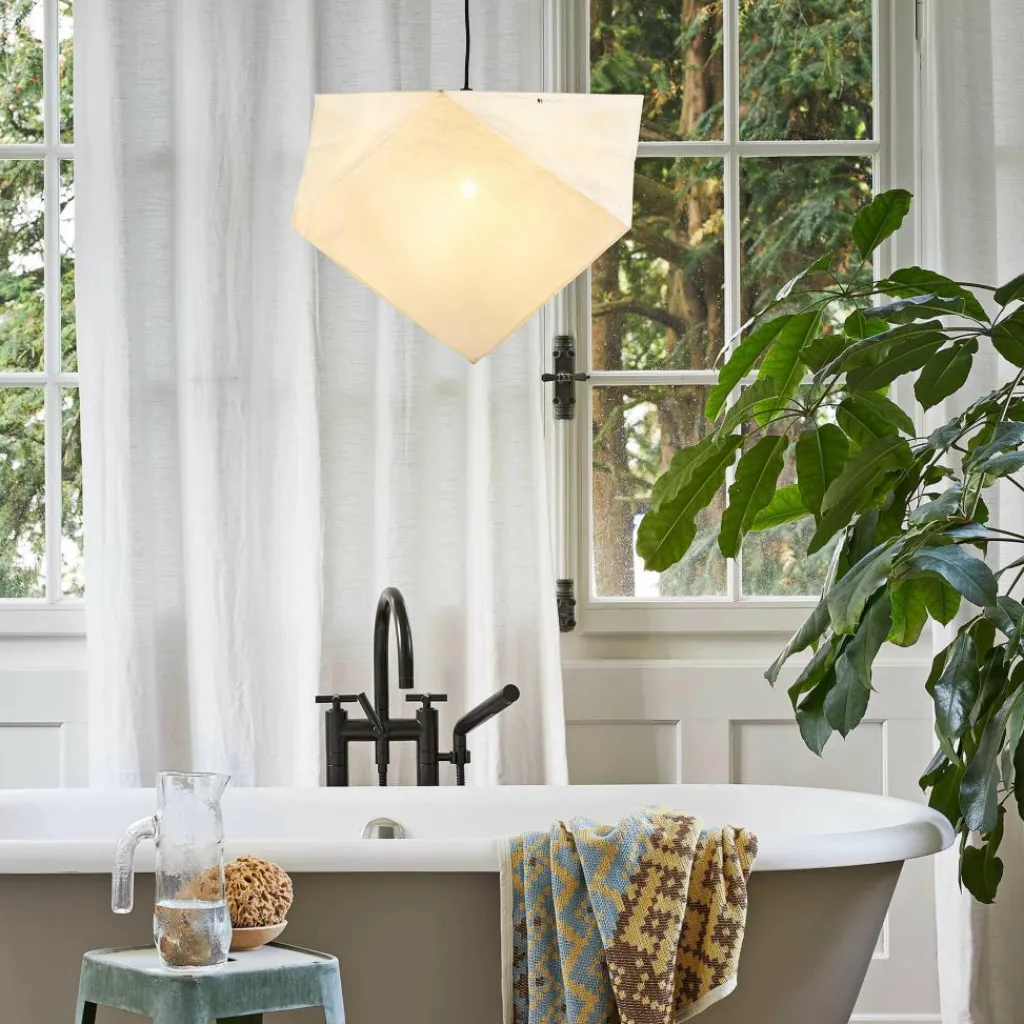 Mit den Maßen von 50 x 50 cm und einer Höhe von 38 cm passt die Akari YP1 perfekt über das Bett im Schlafzimmer oder den Esstisch im Wohnzimmer. Für die Herstellung wird das Washi-Papier auf Bambusruten aufgezogen. Es verbreitet das Licht gedämpft und gleichmäßig im Raum. Nach der Trocknung wird das Holzgestell entfernt. Die Abschlüsse des Schirms bestehen aus Bambus und Holz, der Fuß ist aus bemaltem Stahldraht gefertigt.
