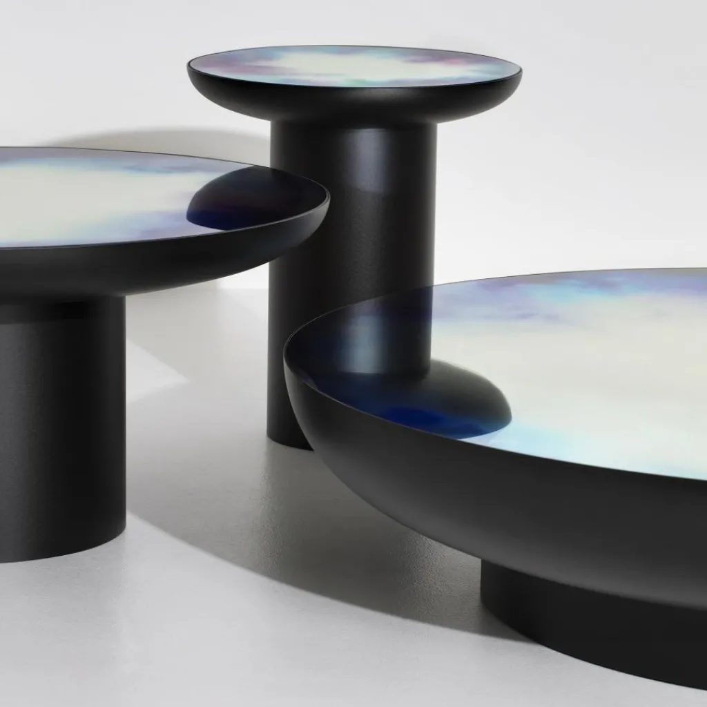 Der Francis Extra Large Mirror Couchtisch wurde von Constance Guisset für die Marke Petite Friture entworfen. Mit diesem Entwurf hat die französische Designerin einen Höhepunkt ihrer Serie von Francis-Tischen geschaffen, die durch die ungewöhnliche Verbindung von spiegelnden Flächen, tiefgründigen Farbschattierungen und schlichten Formen große Anerkennung finden. Der Francis Extra Large Mirror Couchtisch wurde auf dem Salone del Mobile in Mailand mit dem Stylepark Selected Award ausgezeichnet. Die runde Tischplatte ist eine spiegelnde Fläche, auf die ein handgemaltes Aquarell der Designerin in mehreren durchscheinenden Schichten aufgetragen wurde. Die zarten Pastellfarben und die changierenden Konturen erzeugen ein harmonisch ausgewogenes Bild mit einer geheimnisvollen Tiefe. Eine Schicht aus Verbundglas schützt die Oberfläche vor mechanischen Beanspruchungen und Flüssigkeiten.