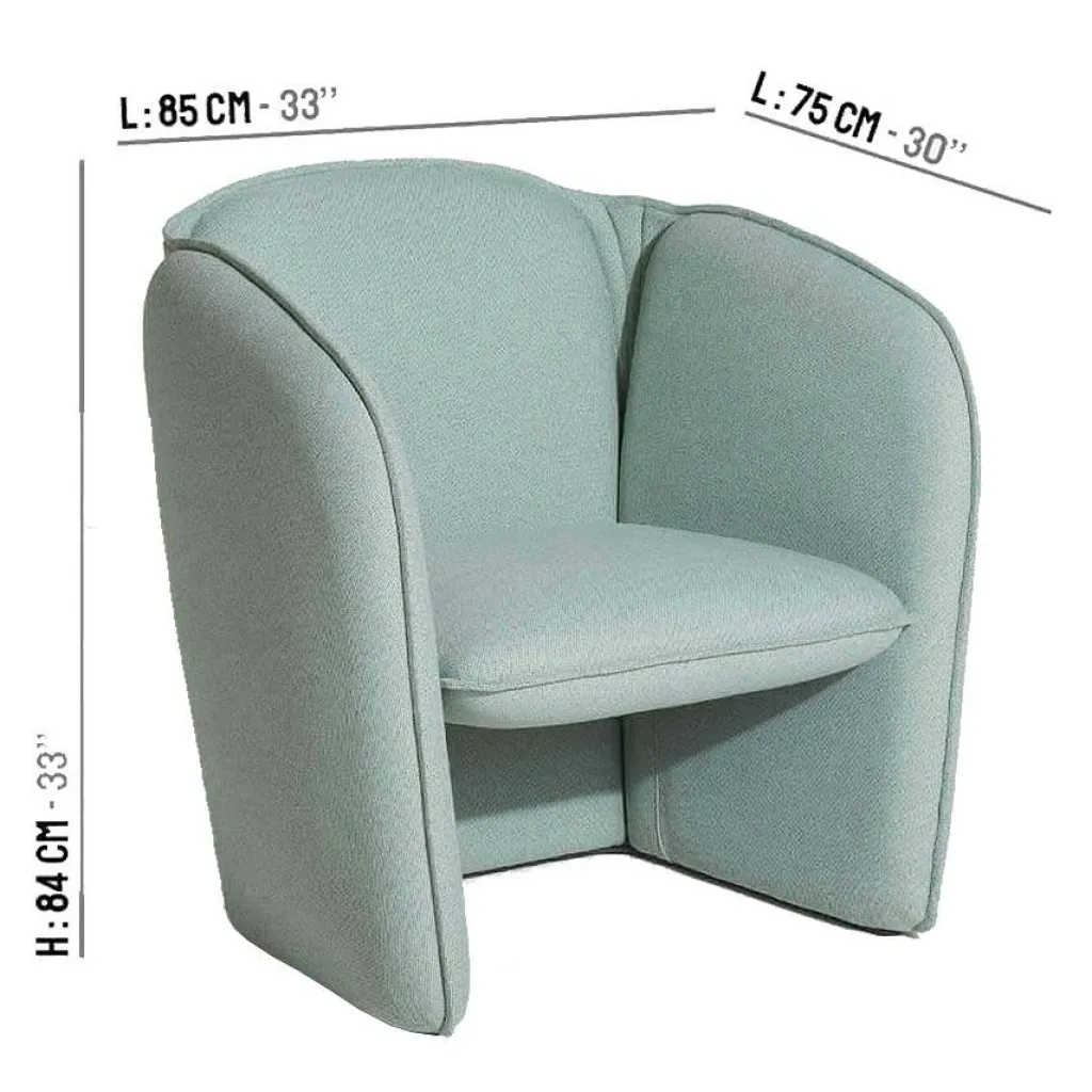 Der Lily Sessel hat ein Gewicht von 39 kg. Die Sitzhöhe beträgt 45 cm. Das Modell ist 84 cm hoch und 85 cm breit. Das 75 cm tiefe Möbelstück passt zu jedem Couchtisch.