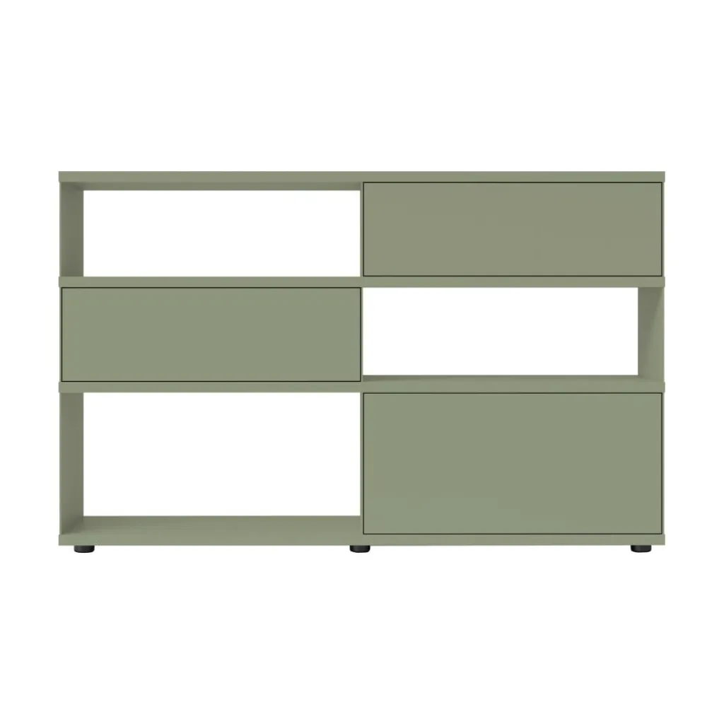 Mit seinen lang gestreckten Feldern und den glatten Türen drückt das Flow Q Sideboard mit 2 Schubkästen und Klapptür 160x99x40cm Ordnung und Aufgeräumtheit aus. Seine zarten Seitenwände zeigen einen leichten Charakter, während die kräftigen Regalböden eine robuste Belastbarkeit versprechen. Sie können schwere Bücher oder Akten aufnehmen. Gleichzeitig bieten zwei Schubkästen und eine Klapptür sensiblen Bürounterlagen oder privatem Krimskrams Schutz vor neugierigen Blicken. Die grifflosen Beschläge sind mit einer raffinierten Push-to-open-Mechanik ausgestattet. Die Box lässt sich von beiden Seiten bedienen, weshalb das Flow Q Sideboard mit 2 Schubkästen und Klapptür 160x99x40cm nicht nur an einer Wand, sondern auch mitten im Raum stehen kann. Aus matt lackierten MDF-Platten gefertigt, lässt es sich einfach reinigen und eignet sich fürs Büro genauso wie fürs Wohnzimmer.
