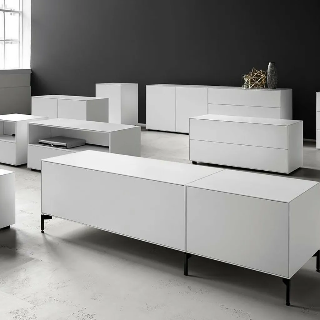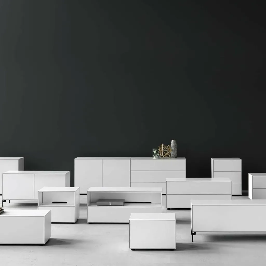 Ob als dekoratives Sideboard im Wohnzimmer oder als praktische Aufbewahrungslösung im Flur: Die Nex Pur Box 2.0 Schubkastenbox/Kommode 120x50x48cm wertet jedes Ambiente auf. Charakteristisch für die Nex-Pur-Kollektion ist der akkurat gefertigte Korpus aus einer oben durchgehenden dünnen Abdeckplatte und Außenseiten, die genauestens auf Gehrung geschnitten sind, perfekt aufeinanderstoßen und so für filigrane Schattenfugen sorgen. Zum Verstauen verfügt die Kommode über zwei breite, übereinanderliegende Schubkästen mit leichtgängigem Auszug. Die grifflose Front strahlt ästhetische Zurückhaltung und Ruhe aus. Mit ihrer glatten, monochromen Oberfläche ist die Kommode in verschiedenen matten Farben erhältlich. Sie ist ausschließlich in Deutschland aus schadstoffarmen Materialien gefertigt und besteht aus hochwertiger MDF. Das Modell steht auf 3cm hohen runden Gleitfüßen, die sich um 1cm justieren lassen. Nicht im Lieferumfang enthalten, aber als Zubehör erhältlich sind 15cm hohe Eckfüße, die der Kommode eine beinahe schwebende Anmutung verleihen.