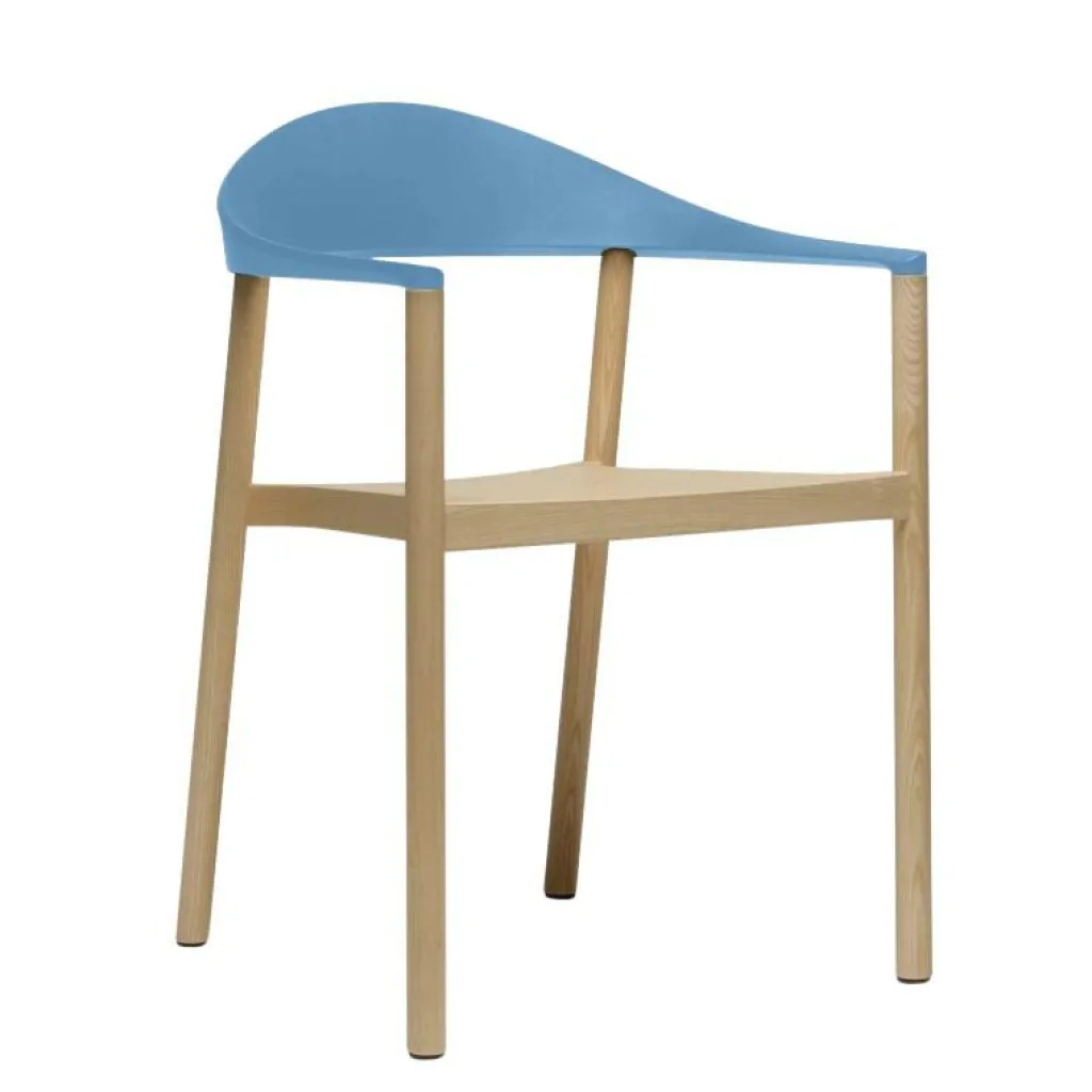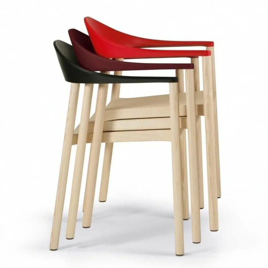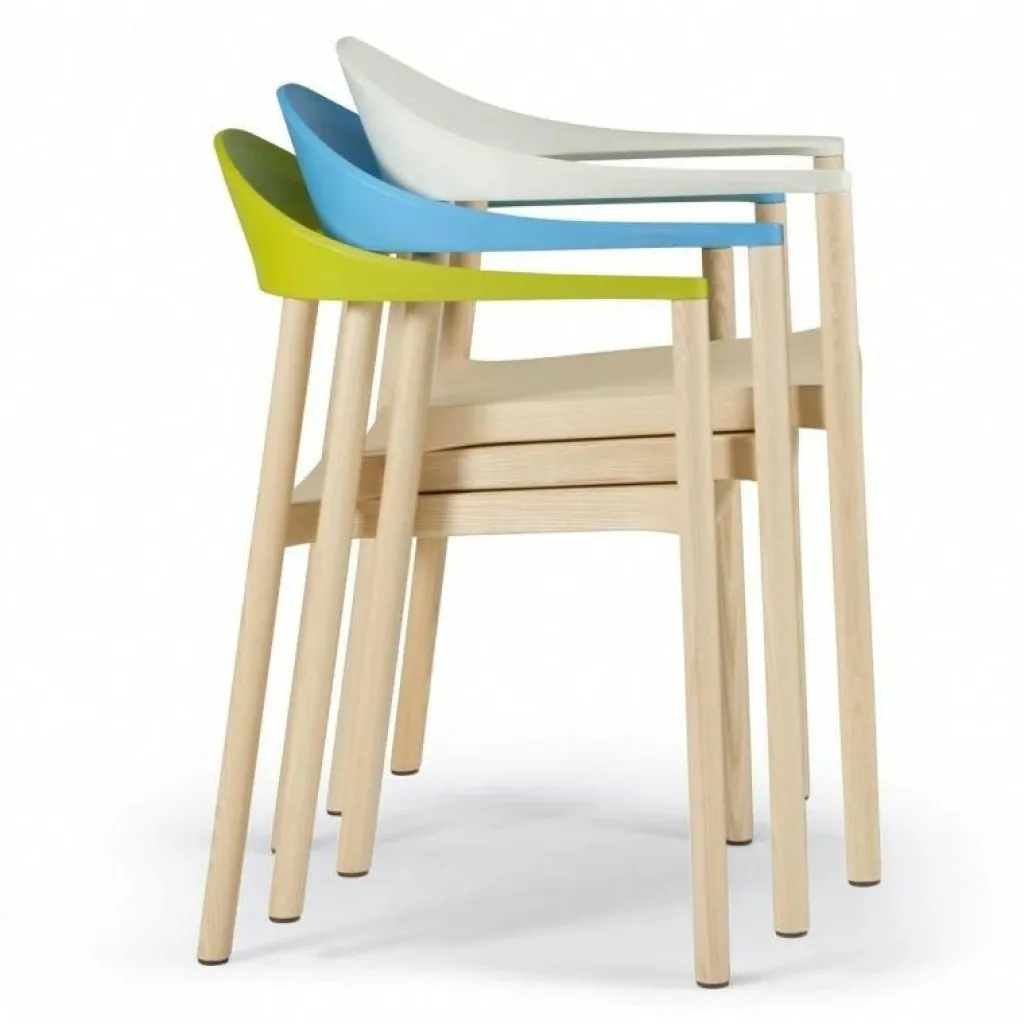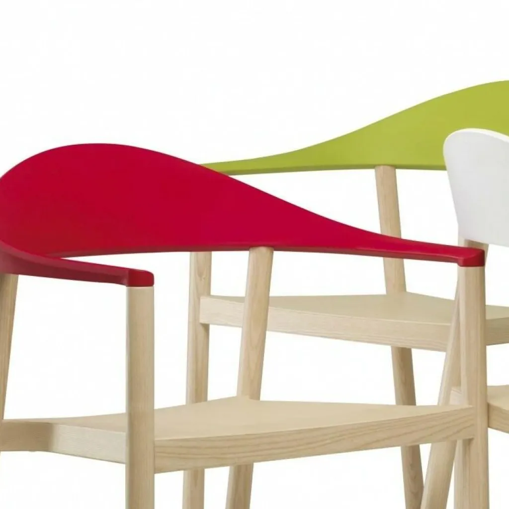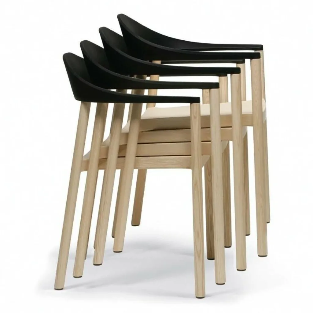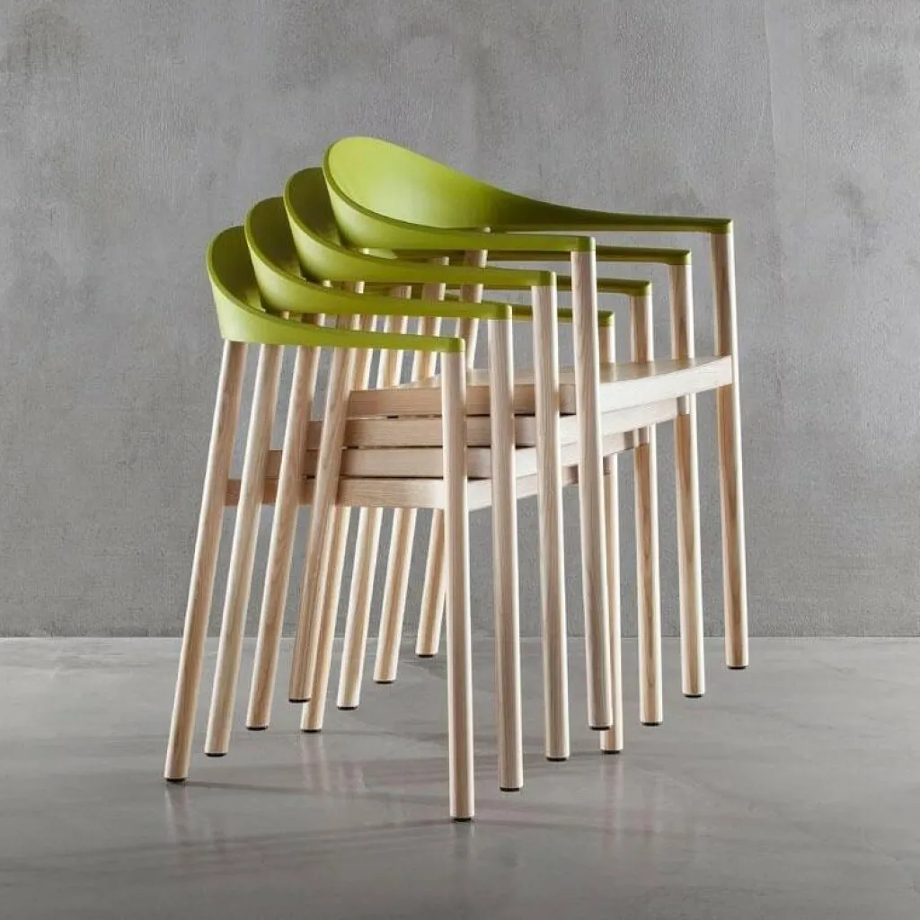 Der Stuhl verbindet die Materialien Holz und Kunststoff-Spritzguss und somit die handwerklichen Wurzeln der Firma Plank mit den charakteristischen Merkmalen des modernen Industriedesigns. Dem Armlehnenstuhl Monza liegt eine reduzierte Holzkonstruktion zugrunde, die sich formal an die Typologie skandinavischer Holzstühle anlehnt.