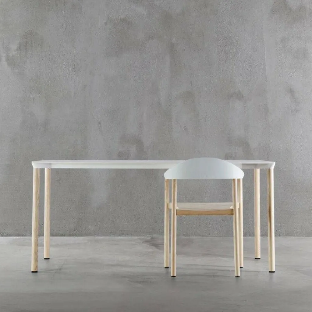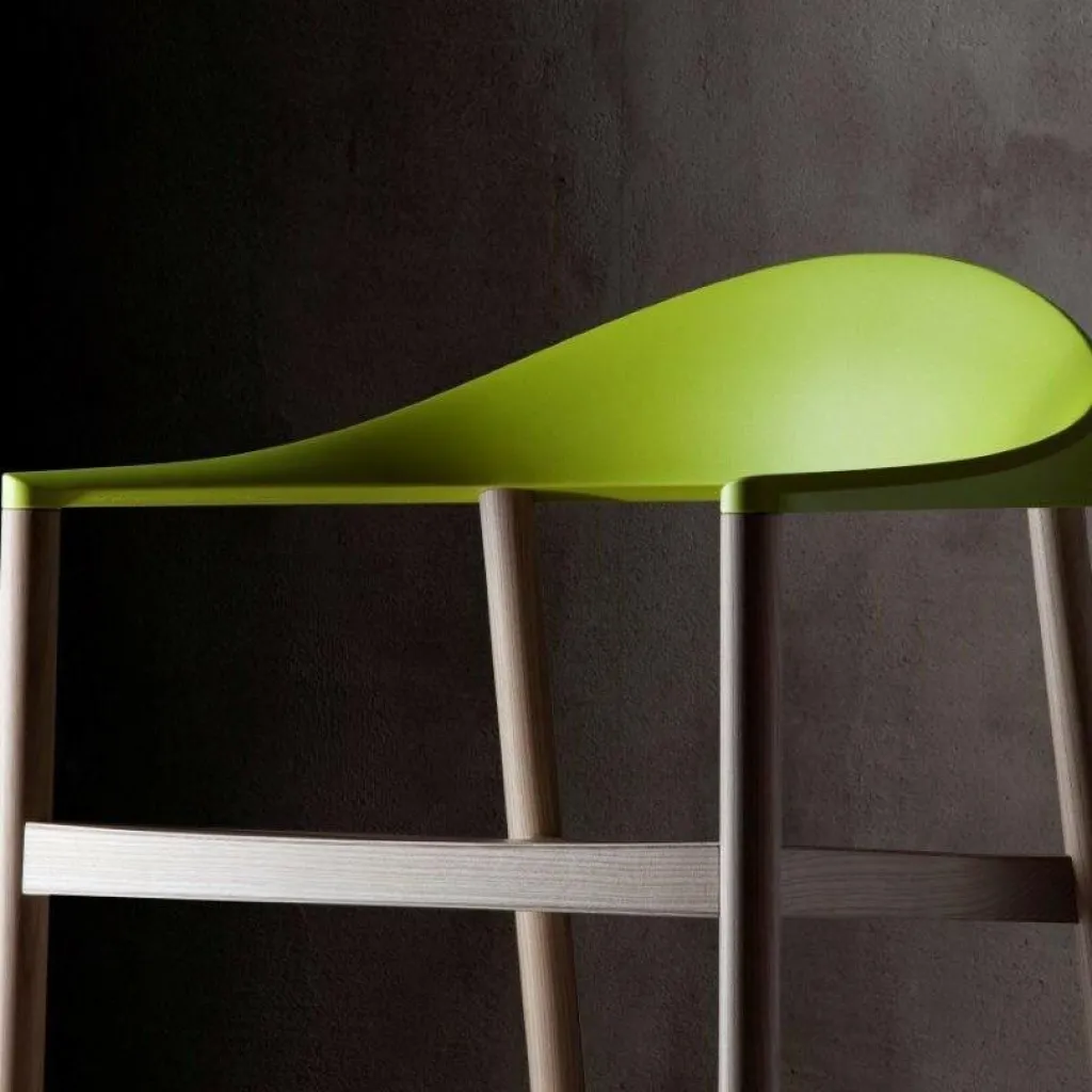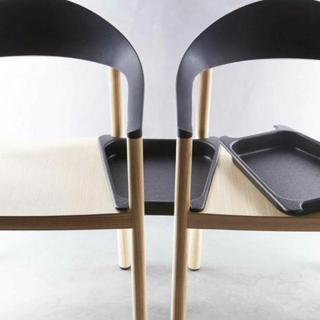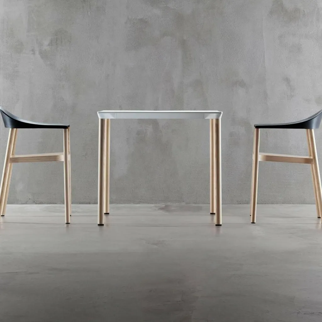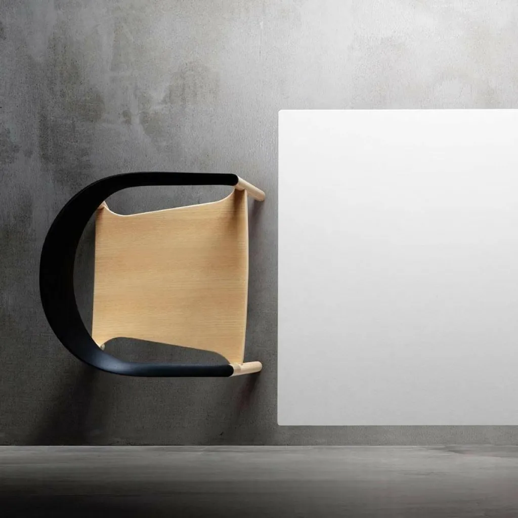 Der Myto Stuhl besitzt einen Charakter, der durch den Kunststoffaufsatz definiert wird, der einerseits für die Stabilität der Konstruktion sorgt und darüber hinaus dem Stuhl Komfort sowie Farbigkeit verleiht.