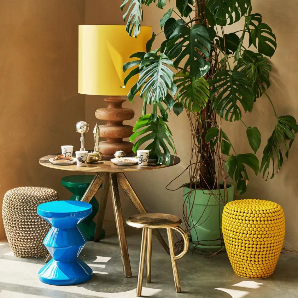 Verspielt und stilvoll sieht der Dot Hocker aus. Er wird im Wohnzimmer zur zusätzlichen Sitzgelegenheit oder lädt dazu ein, die Füße hochzulagern. Doch auch in Boutique-Hotels wird der außergewöhnliche Dot Hocker zum Hingucker. Den niedrigen Hocker schmücken zahlreiche Eisenkugeln, die je nach Modell pulverbeschichtet oder mit Farbe versehen sind. Somit wirkt er wie ein Möbel aus 1001 Nacht. Mit seinem orientalischen Flair harmoniert der Dot Hocker sowohl mit modernen Möbeln als auch mit traditioneller Einrichtung aus Holz.