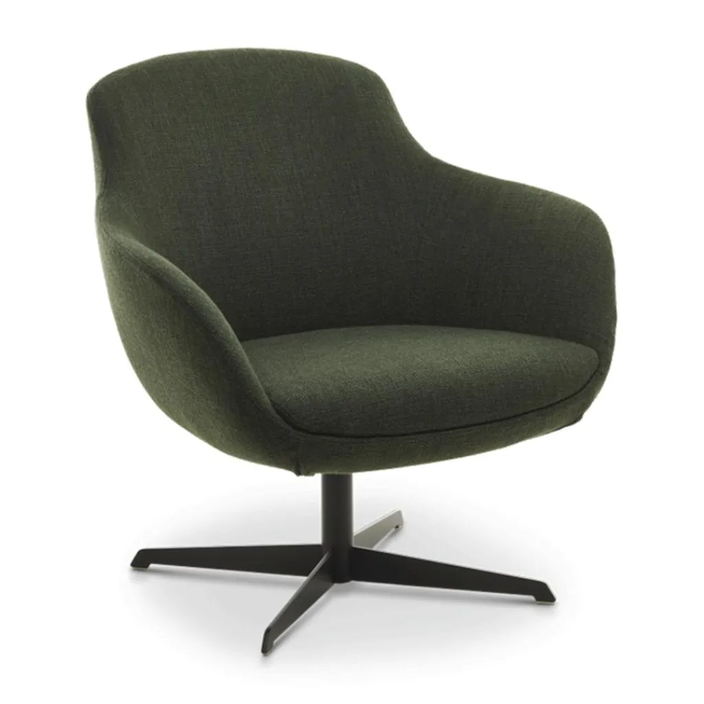 Eine innovativ gestaltete Sitzschale, drehbar auf einer einbeinigen Konstruktion mit vier Standfüßen – damit versprüht der Spock Drehstuhl einen stylishen Charme und praktische Funktionalität zugleich. Der gepolsterte Holzfasersitz, der sich in die formschön abgerundete und ebenso gepolsterte Schale schmiegt, sowie die hohe Rückenlehne, die sich in einem eleganten Schwung in den Armlehnen fortsetzt, versprechen einen angenehm weichen Sitzkomfort. Seine langlebige Strapazierfähigkeit verdankt der Spock Drehstuhl dem hochwertigen Stoffbezug, der sich aus 70 % Polyester und 30% Polyacryl zusammensetzt. Die Basis ist aus pulverbeschichtetem Stahl gefertigt, das dem Designmöbel eine robuste Stabilität verleiht. Als Solitär ist der S pock Drehstuhl ein entspannter Rückzugsort zum Lesen, er passt gut in eine Bücherecke oder ans Fenster. Im Ensemble mit anderen Sitzmöbeln macht er sich ebenso gut um den Besprechungstisch im Büro, in der Lounge eines Hotels oder im Wohnzimmer daheim.