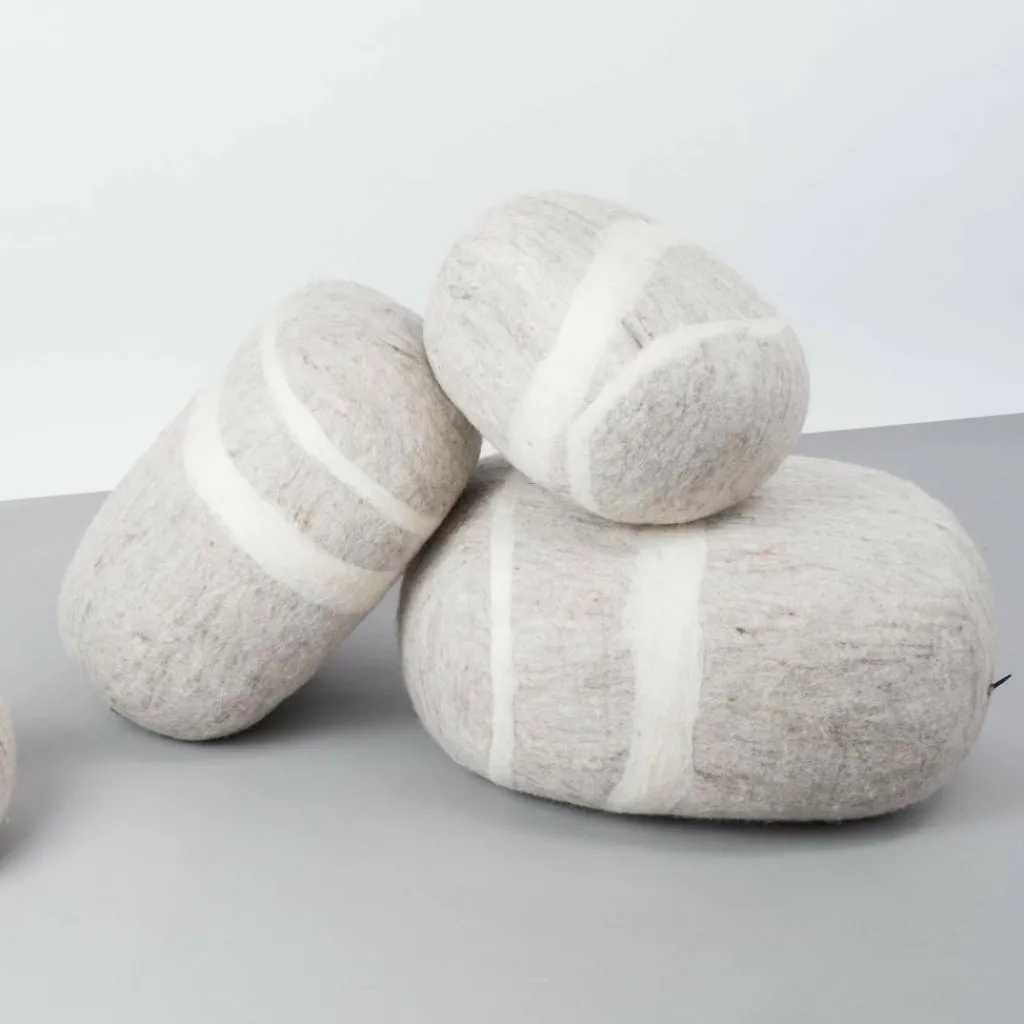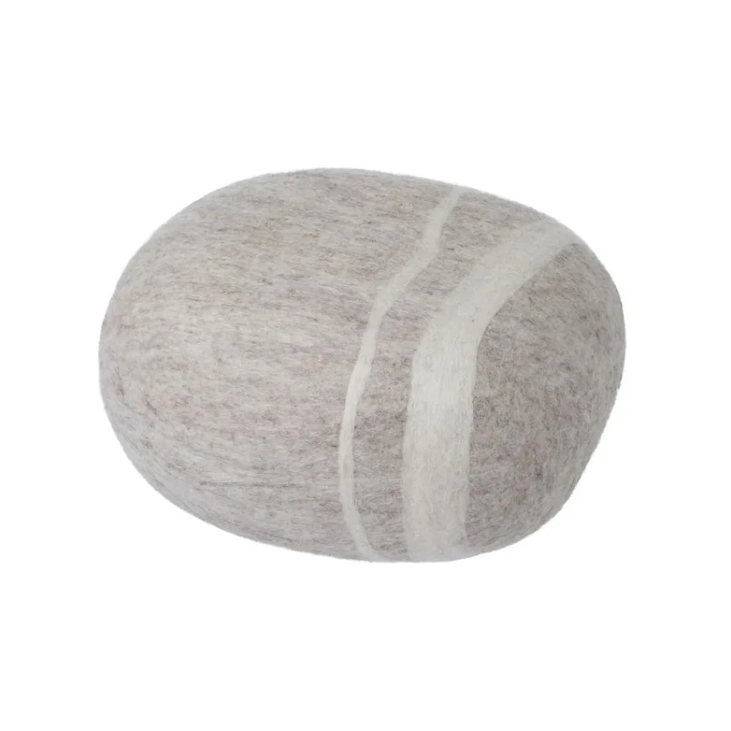 Vor allem die abgeflachte, ovale Form und Quarzgänge imitierenden Streifen verleihen dem Béla Kieselstein Pouf eine realistische Optik. Hergestellt wurde das Modell aus 100% nachhaltig produzierter neuseeländischer Schurwolle, die für ihre Reinheit und hohe Qualität bekannt ist und technisch aufwendig von Hand in vielen Schichten gefilzt wurde. Der synthetikfreie Wollfilz bietet optimale Festigkeit. Neben einer natürlichen, wasser- und schmutzabweisenden Oberfläche überzeugt das Material auch durch seine Thermoregulationseigenschaften, die für ein angenehmes Raumklima sorgen. Das Modell ist nicht nur als Sitzgelegenheit und Fußhocker ideal, sondern eignet sich auch als Yoga- und Meditationskissen.