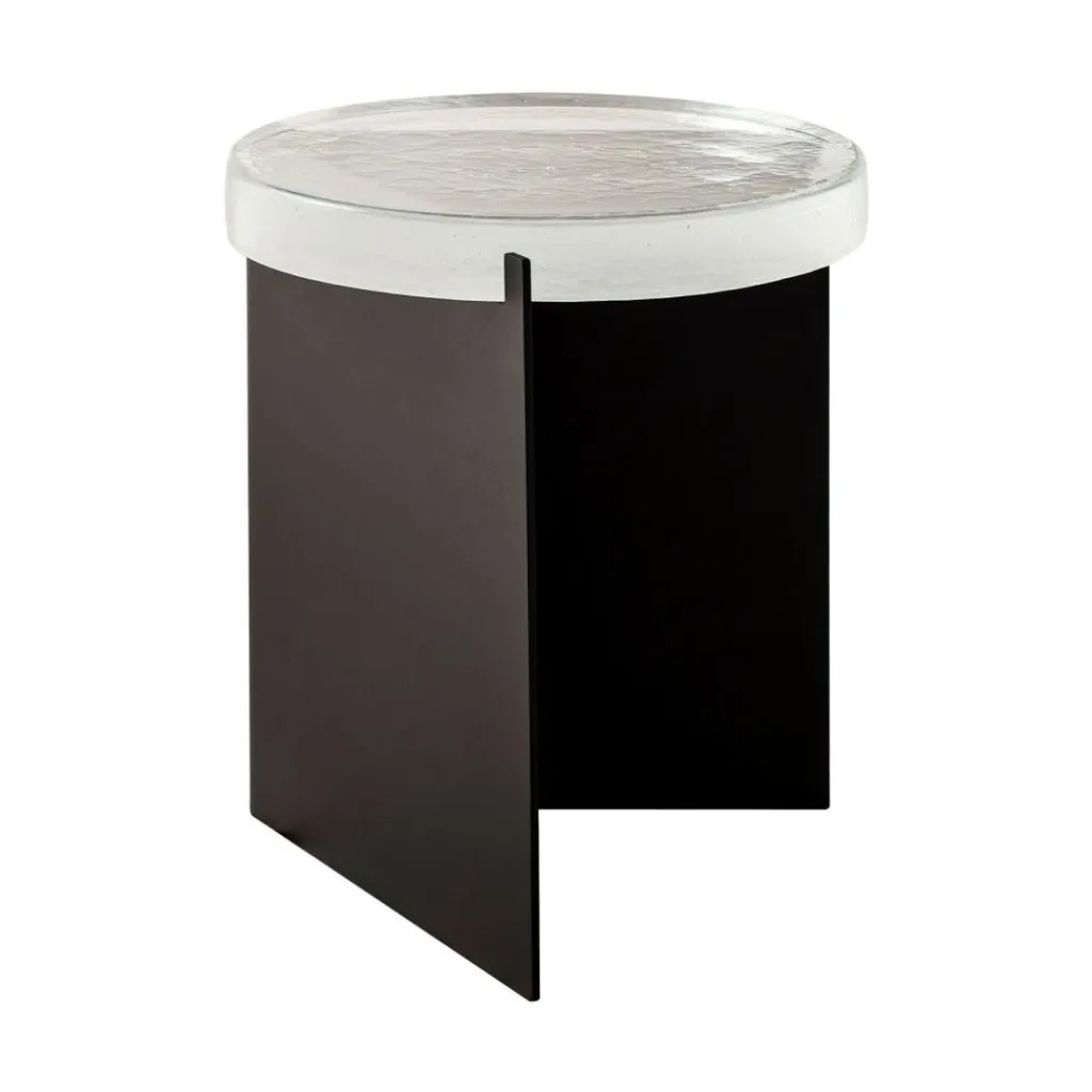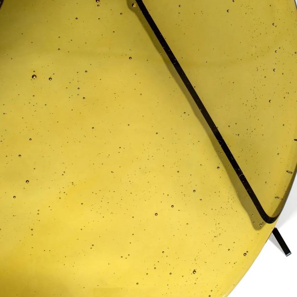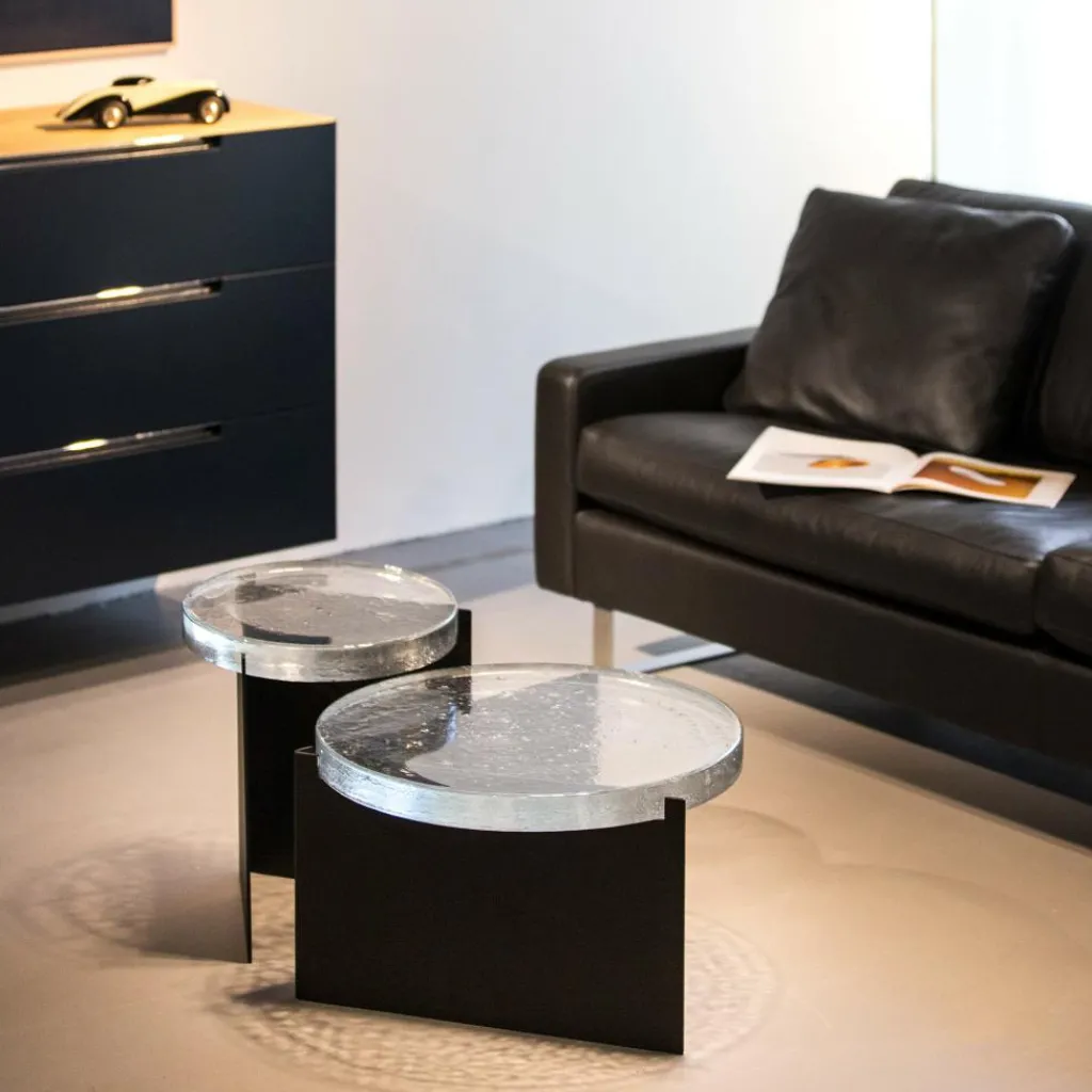 Die spezielle Struktur der Tischplatte mit 38 cm Durchmesser entsteht durch einen langen Fertigungsprozess: Flüssiges Glas gelangt in eine Form, wo es mehrere Tage aushärtet. Dabei entstehen einzigartige Einschlüsse und kleine Bläschen in dem Naturmaterial. Das Resultat sind 5 cm hohe Tischplatten, die sich mit ihrer Einzigartigkeit auszeichnen.