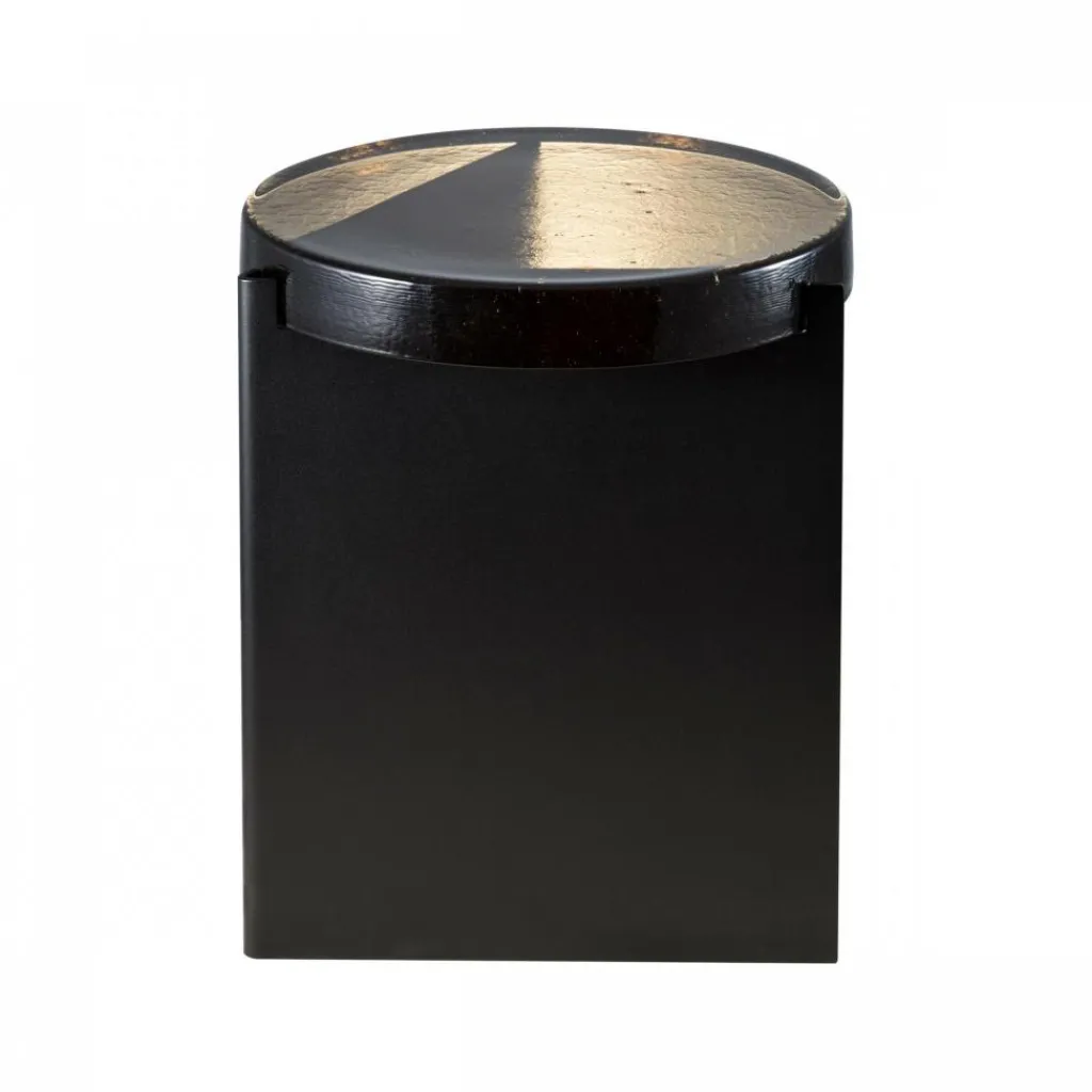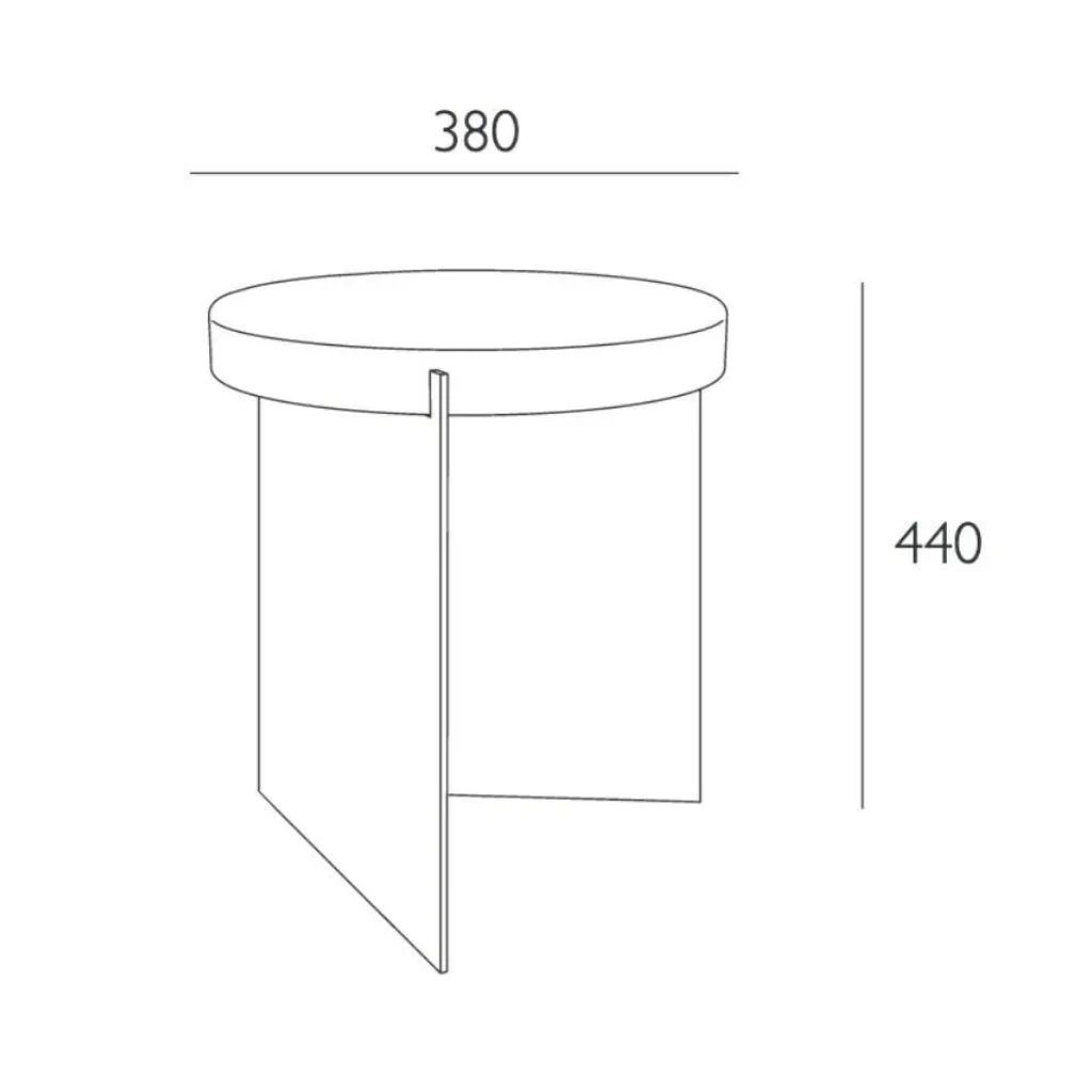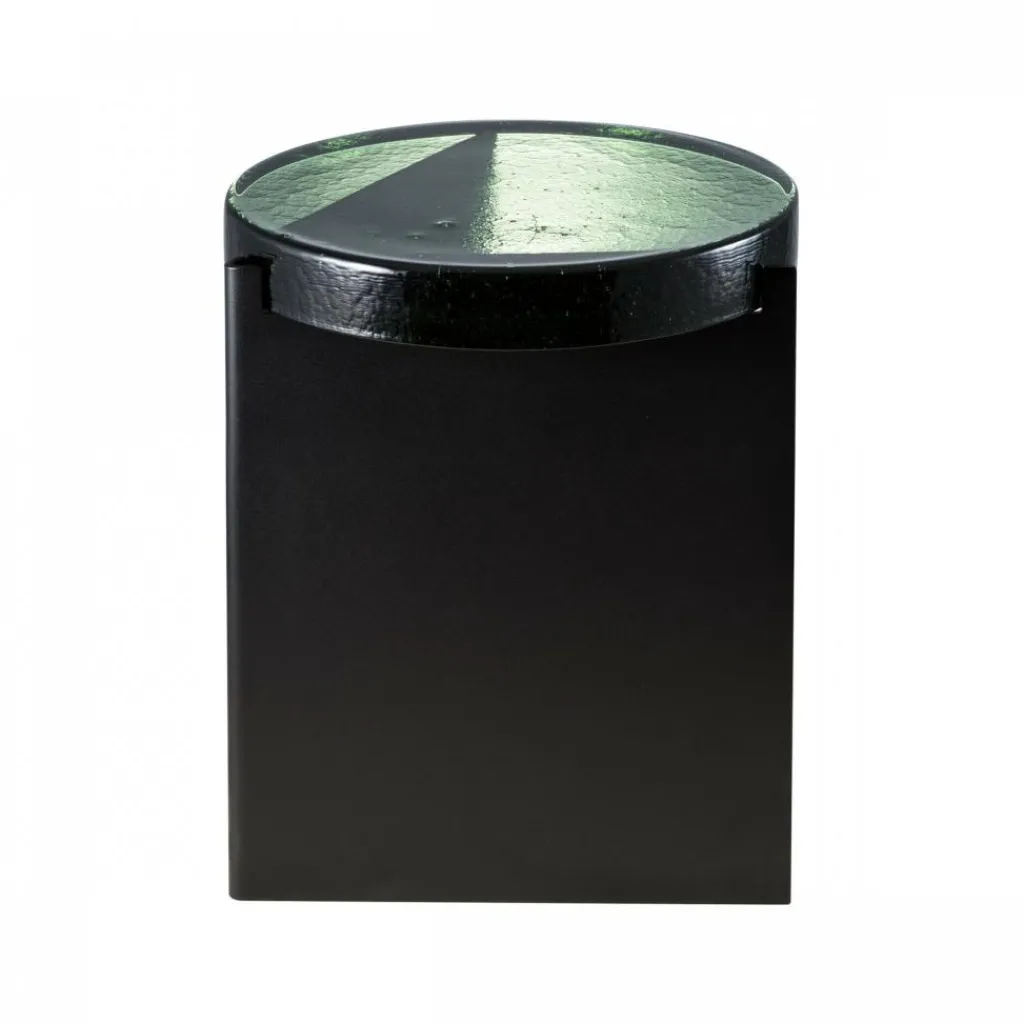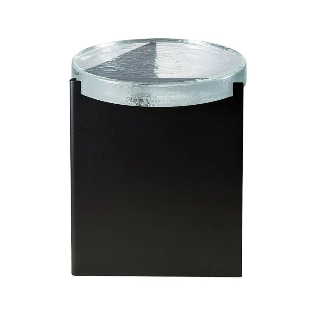 Die spezielle Struktur der Tischplatte mit 38 cm Durchmesser entsteht durch einen langen Fertigungsprozess: Flüssiges Glas gelangt in eine Form, wo es mehrere Tage aushärtet. Dabei entstehen einzigartige Einschlüsse und kleine Bläschen in dem Naturmaterial. Das Resultat sind 5 cm hohe Tischplatten, die sich mit ihrer Einzigartigkeit auszeichnen.