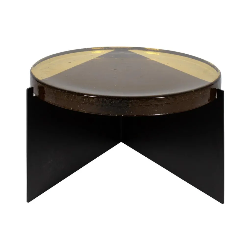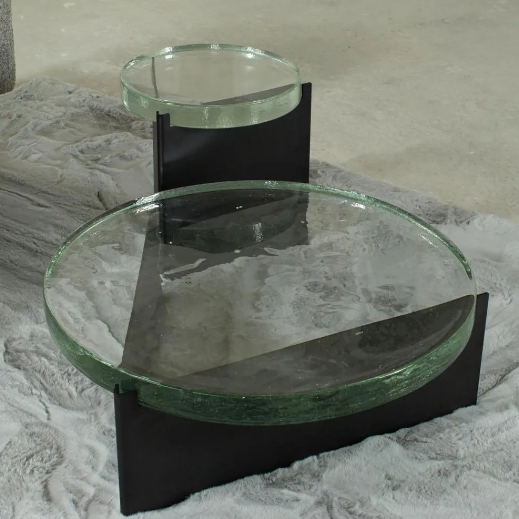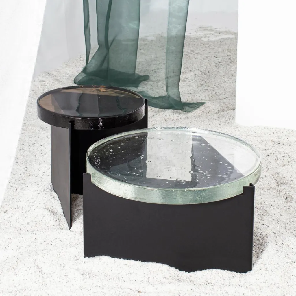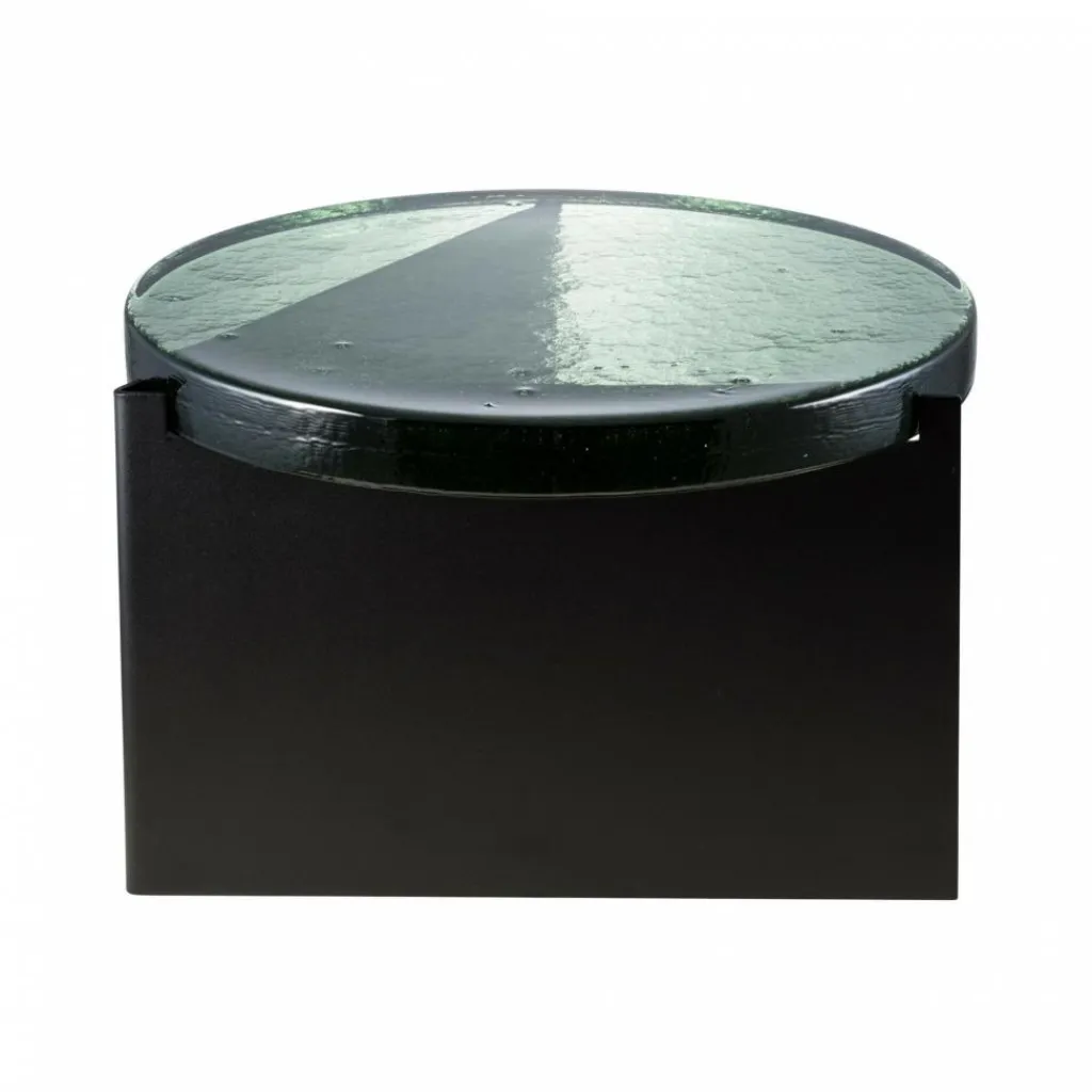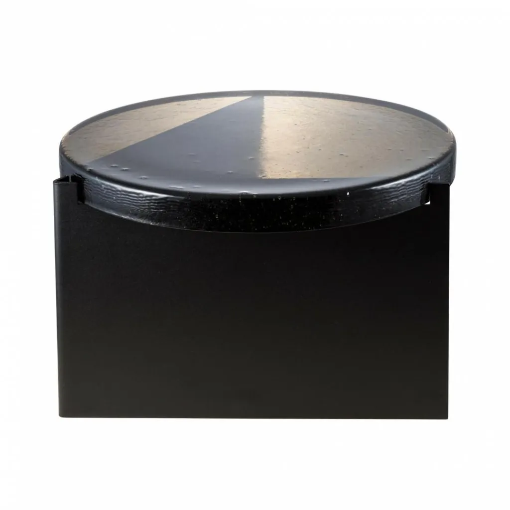 Üblicherweise werden Beistelltische mit einer Glasplatte nach dem 1902 patentierten Floatglasverfahren gefertigt, das ebenmäßige Oberflächen erzeugt. Nicht so der Alwa One Big Beistelltisch, der in einem langwierigen Prozess entsteht: Flüssiges Glas wird in eine Metallform gegossen, wo es über viele Stunden erkaltet. Während des Vorgangs zeigen sich kleine Blasen und Einschlüsse. Sie machen jeden Alwa One Big Beistelltisch zum Unikat. Die Struktur erinnert ganz deutlich an Luftblasen, die im Wasser an die Oberfläche perlen. Einen interessanten Kontrast zur markanten Glasplatte mit einem Durchmesser von 56 cm bildet das schwarze Stahlgestell, das sicheren Stand gewährleistet.