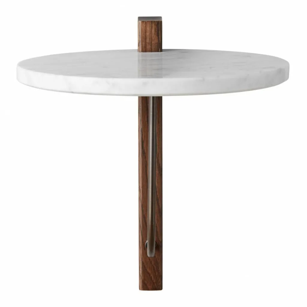 In dem Corbel Wandregal verschmelzen die unterschiedlichen zum Einsatz kommenden Materialien zu einem harmonischen Kontrast: Von feinen, grauen Adern durchzogener Carrara-Marmor begegnet dunkel gebeizter, massiver Eiche und pulverbeschichtetem Stahl. So dient die runde Marmorplatte als Regalfläche, während das Holzelement als geradlinige Wandhalterung und das Metall als dekorativer Arm zum Einsatz kommen. Die detailreiche Konstruktion überzeugt Liebhaber geometrischer Linien mit ihrer klaren Formensprache, die sich mit Leichtigkeit in eklektische oder minimalistische Interieurs einfügt. Dieses zeitgenössische Regal schafft es damit einerseits die Blicke auf sich zu ziehen und bietet andererseits einen praktischen Abstellplatz.