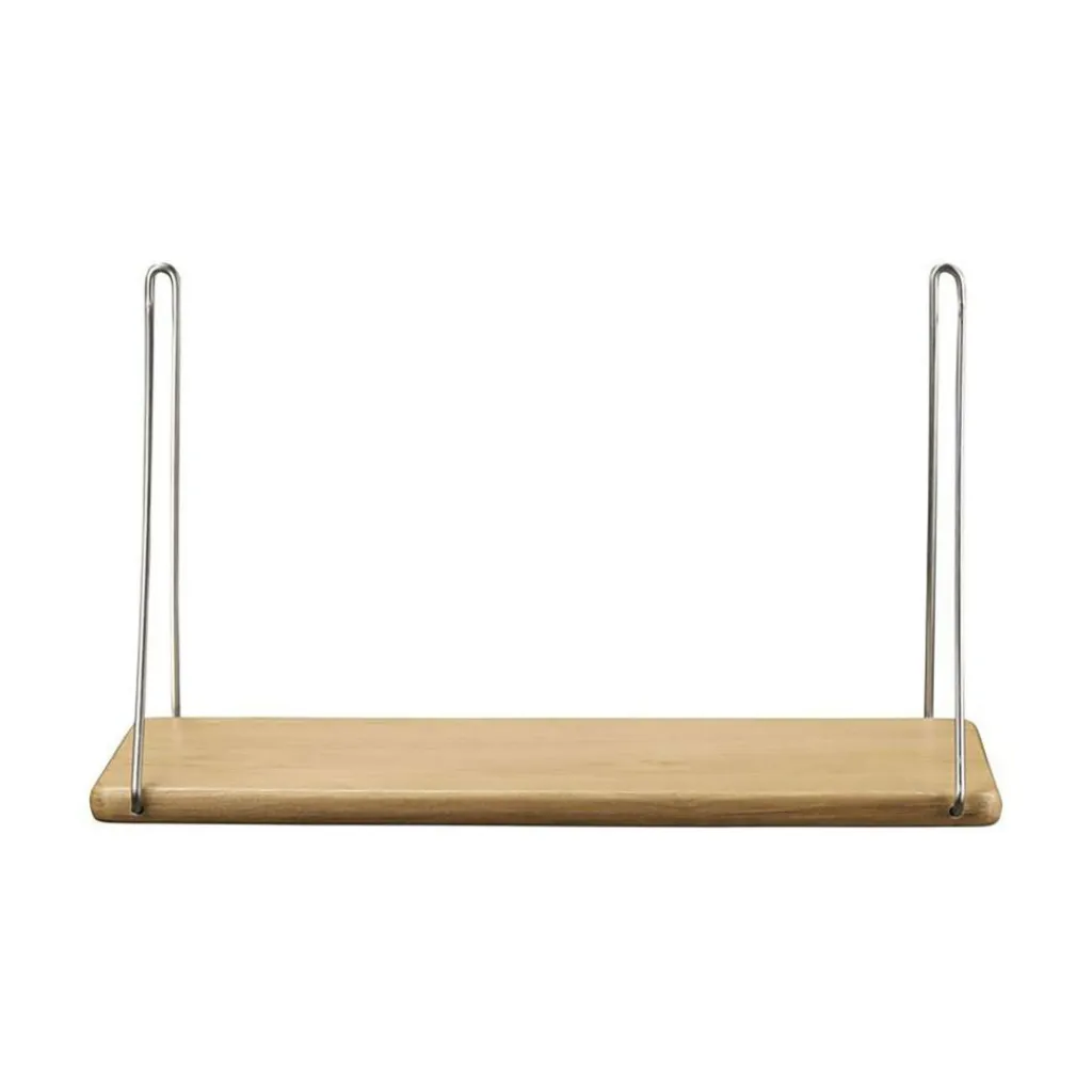 Das B145 Wandregal 45×24,9cm besteht aus einem schlichten Brett aus FSC®-zertifiziertem Eichenholz, das durch seine abgerundeten Ecken eine weiche handwerkliche Note erhält. Getragen wird es von zwei filigranen Wandhaltern aus pulverbeschichtetem Edelstahl, die für einen stabilen Halt und eine dezente Aufhängung sorgen. Die Kombination aus warmem Holz und kühlem Metall verleiht dem Regal eine zurückhaltende Eleganz, die sich mühelos in moderne wie klassische Interieurs einfügt. Mit einer Breite von 45 cm und einer Höhe von 24,9 cm eignet sich dieses kompakte Modell ideal für kleinere Wandflächen – ob als Solist über dem Schreibtisch, neben dem Bett oder in Kombination mit weiteren Regalen als flexible Wandlösung im Wohnzimmer, Flur oder Homeoffice. Das B145 Wandregal 45×24,9cm ist 20 cm tief und wiegt 2,9 kg. Es ist nicht nur dekorativ, sondern auch ausgesprochen funktional: Es bietet Platz für Bücher, Gewürze, Alltagsgegenstände oder kleine Lieblingsstücke. Seine robuste Konstruktion und die hochwertige Verarbeitung machen es zu einem langlebigen Begleiter, der auch Jahrzehnte nach seinem Entwurf nichts von seiner Relevanz verloren hat.