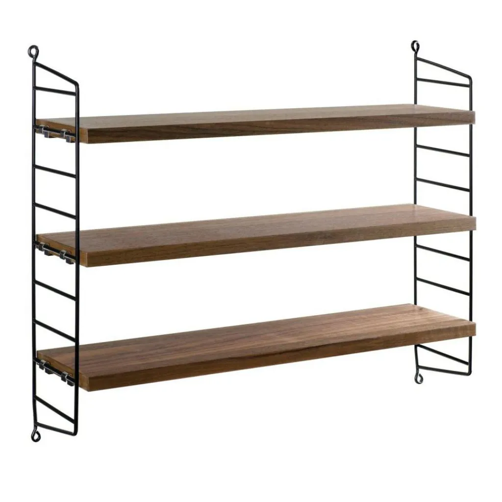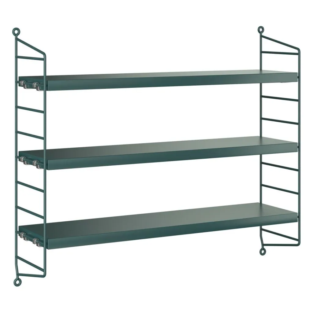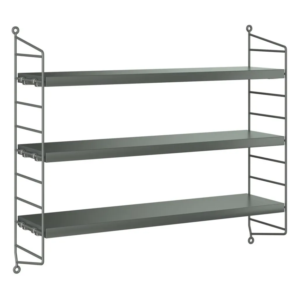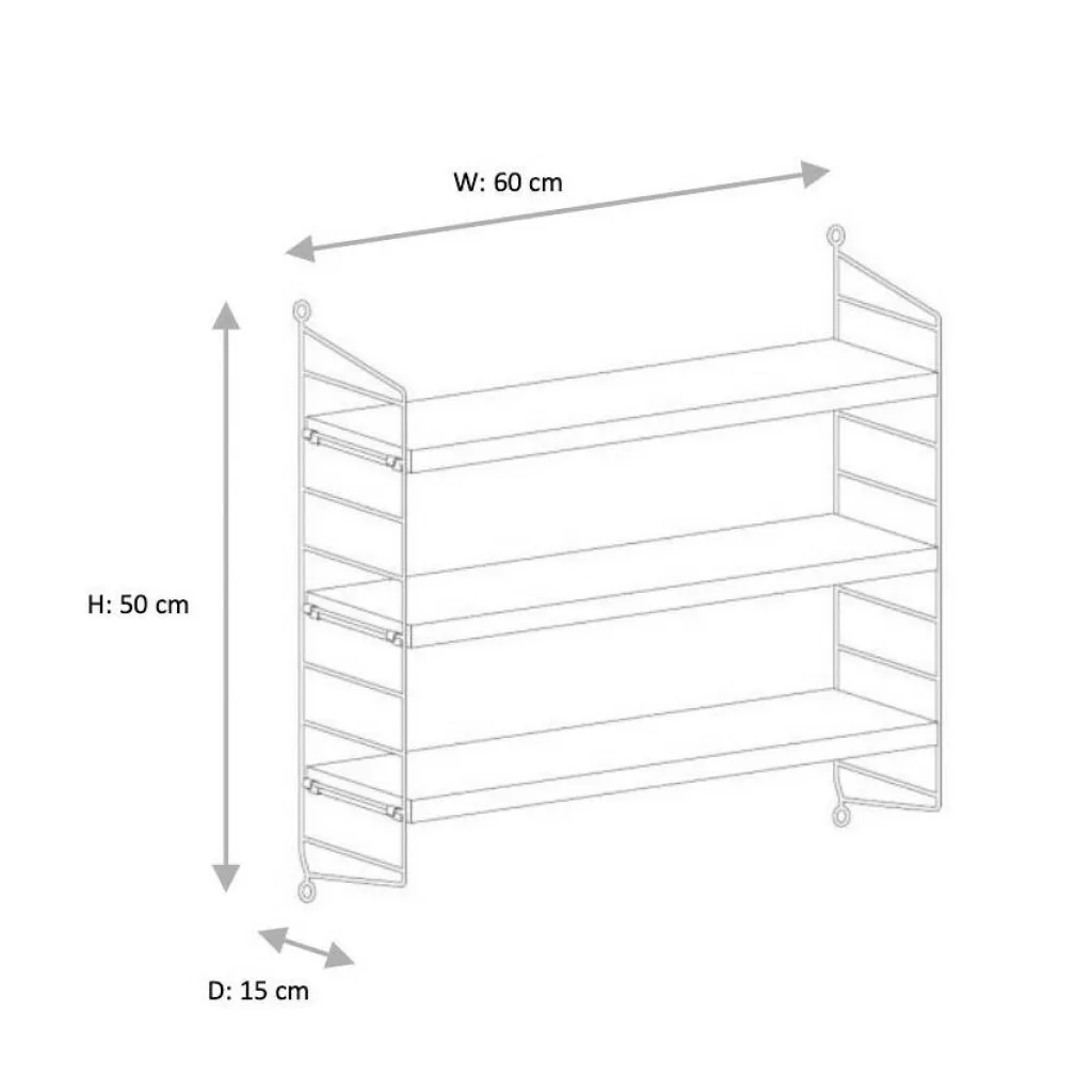 Das String Pocket Regal 60x50x15cm ist in jedem Raum ein praktischer Alltagshelfer. In der Küche können darauf Kräuter, Gewürze und Geschirr abgestellt werden. Es eignet sich auch für Büros, Wohn- und Kinderzimmer. Die seitlich montierten Regalwände ähneln einer Leiter. Zwischen den Sprossen können die drei mitgelieferten Einlagebretter in beliebiger Höhe eingehängt werden. Dazu dienen Klemmen aus Zink. Das Gestell besteht aus pulverbeschichtetem Stahl. Er ist mit wasserbasiertem und schadstoffarmem Lack überzogen. Für die Einlagebretter verwendet der Designer Holz. Es stehen unterschiedliche Farb- und Holzvarianten wie Esche, Eiche und Walnuss sowie zur Auswahl. Jedes Einlagebrett kann mit maximal 25 kg belastet werden.