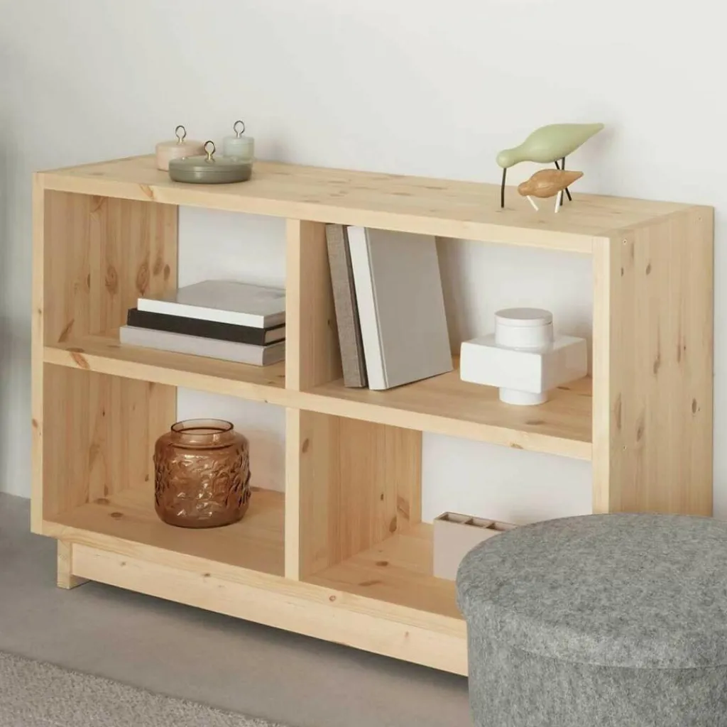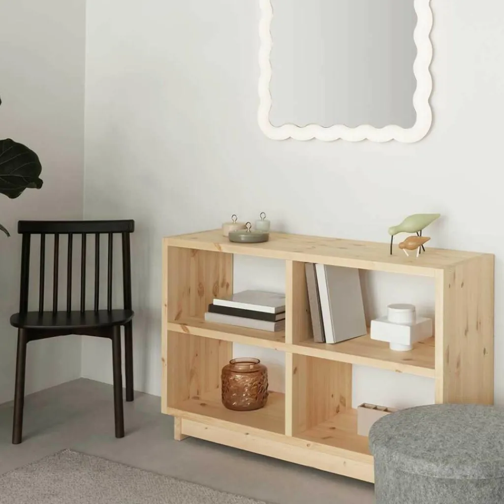 Mit einem einfachen Rahmen und je einer horizontalen und vertikalen Unterteilung lässt sich dieses Aufbewahrungsmöbel mit vier gleich großen Fächern vielseitig verwenden. Da die Elemente großzügig dimensioniert sind, ist keine versteifende Rückwand nötig. Dadurch erlaubt es den Zugriff auf den Inhalt von beiden Seiten und kann sogar als Raumteiler verwendet werden. Der nach innen versetzte Sockel sorgt für einen stabilen Stand und schenkt dem Bücherregal zudem eine optische Leichtigkeit. Zur Gänze aus massiven und namensgebenden Brettern aus Kiefernholz gefertigt, besticht das Plank Bücherregal medium mit seinem natürlichen Aussehen. Die Oberfläche ist mit einem UV-Lack behandelt, der das Aussehen des Holzes schützt und gleichzeitig die Bildung einer attraktiven Patina erlaubt.