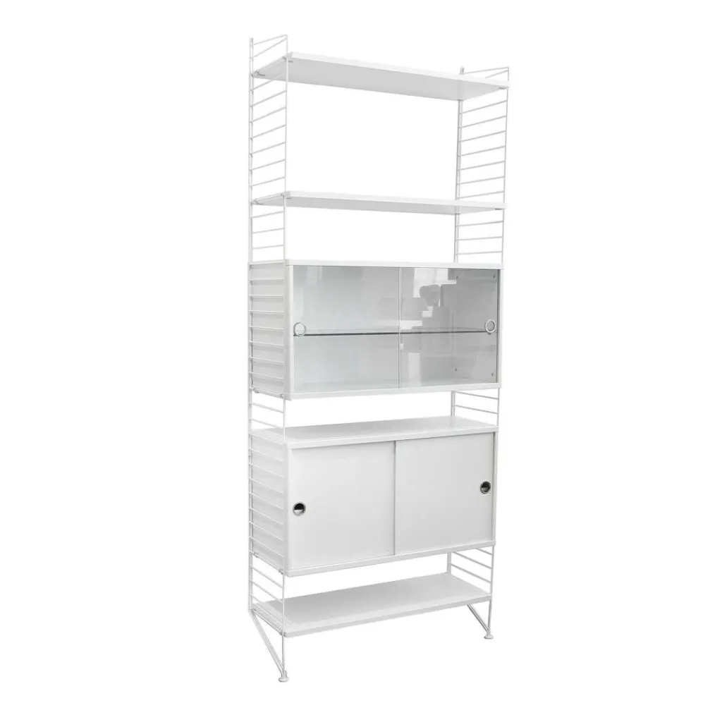 Wahlweise ist das String Combination Regal mit Magazinablage, Hängeschrank mit Schubladen/Schiebetüren oder mit Vitrinenschrank mit Glasschiebetüren bei uns in unterschiedlichen Farbausführungen erhältlich.