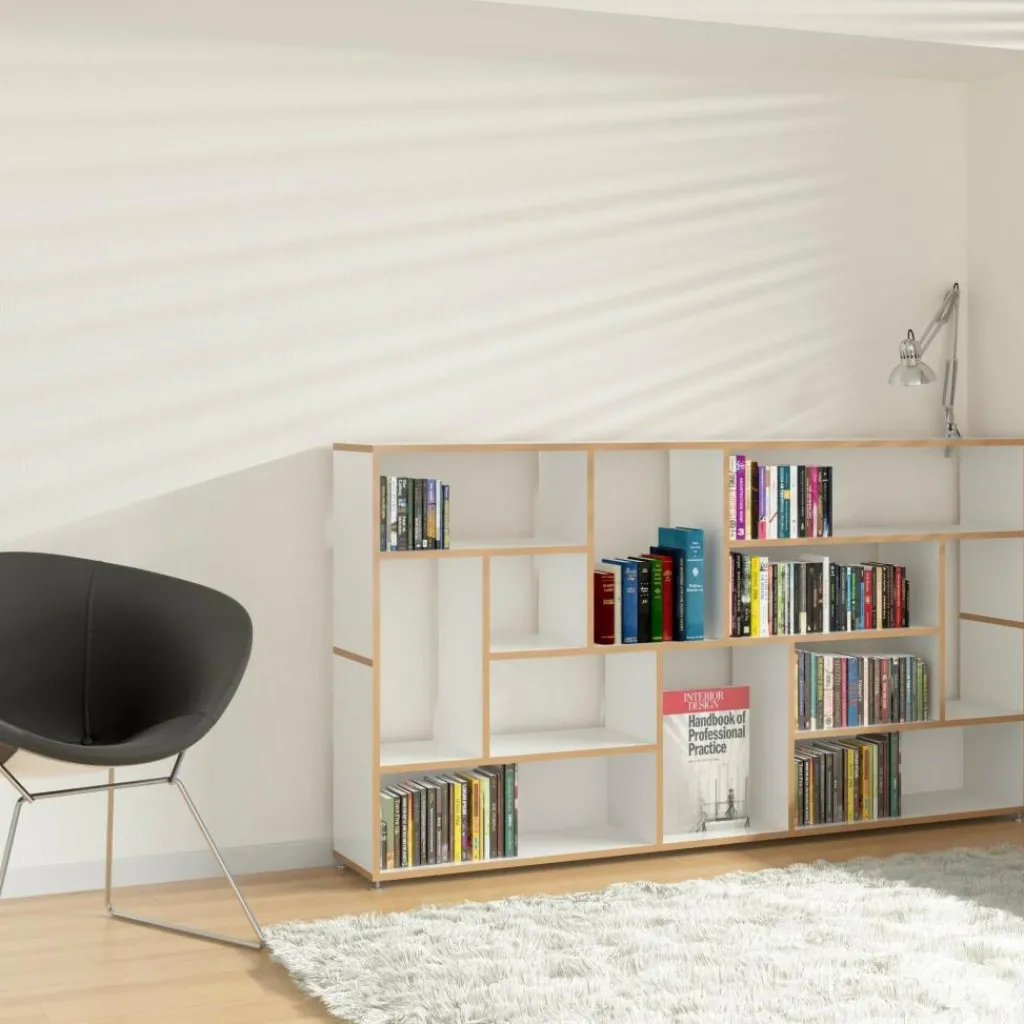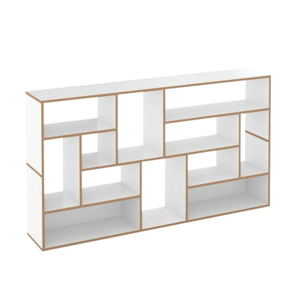 Die ausgeklügelte Konstruktion des Regalsystems basiert ausschließlich auf einzelnen H-förmigen Elementen, die aufeinandergestapelt und durch einen fortschrittlichen Mechanismus ganz ohne Schrauben miteinander verbunden werden. Das modular aufgebaute Möbelstück besteht aus robusten MDF-Platten mit einer schützenden Melaminharz-Beschichtung und bietet optimierte Widerstandsfähigkeit sowie einen stabilen Stand. Die offenen MDF-Kanten setzen sich kontrastreich von den glatten Regalflächen ab und verleihen dem hochwertigen Regalsystem ein reizvolles Aussehen.