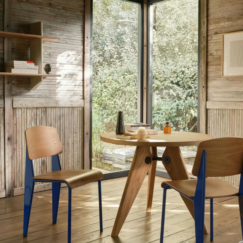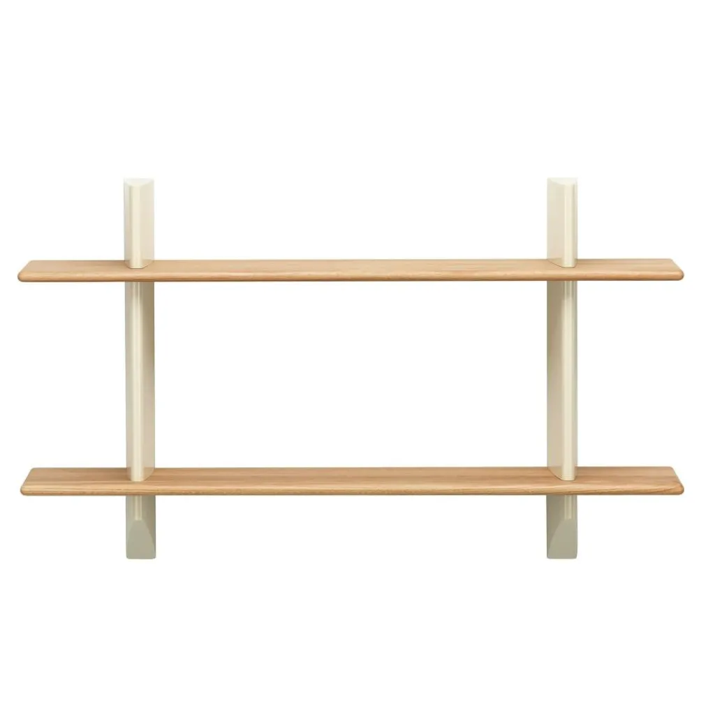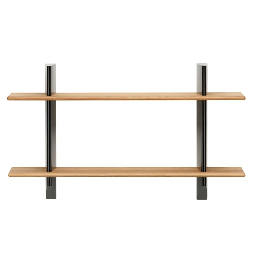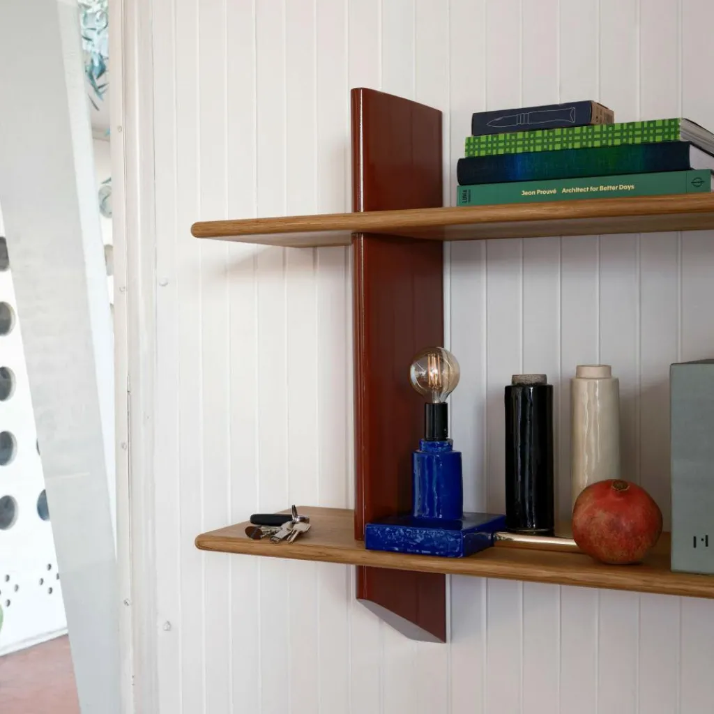 Zwei horizontale Platten als Regalböden, zwei vertikale Elemente als Wandhalterung: Damit ist das Rayonnage Wandregal platzsparend, praktisch und schafft darüber hinaus eine dekorative Gliederung der Wand. Dabei besticht das Wandregal nicht nur mit seiner einfachen Konstruktion. Die Wandelemente sind aus gebogenem Stahlblech gefertigt, das dank seiner abgerundeten Vorderseite und der schrägen Unterkante an einen Flugzeugflügel oder ein Schiffsruder erinnert – eine typische Form in Prouvés Entwürfen. Präzise gearbeitete Einschübe für die Regalböden versprechen eine hohe Stabilität. Je nach gewählter Ausführung schaffen die lackierten Elemente einen knalligen Farbtupfer an der Wand oder treten dezent in den Hintergrund. Die gebeizten und geölten Holzböden aus massiver Eiche erzeugen mit ihrer zarten Maserung eine natürliche Wirkung. So ist das Rayonnage Wandregal in jedem Wohnraum einsetzbar und passt ebenso gut ins Büro, in einen Laden oder in ein Lokal.