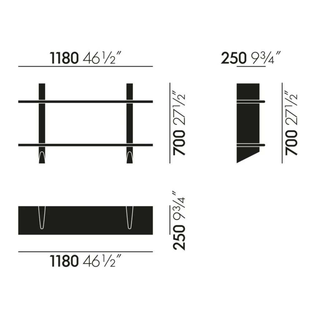 Das Rayonnage Wandregal hat eine Breite von 118cm und eine Höhe von 70cm. Es misst 25cm in der Tiefe und ist in verschiedenen Farben erhältlich. Das Refgal wiegt je nach gewählter Ausführung 10kg oder 18kg.