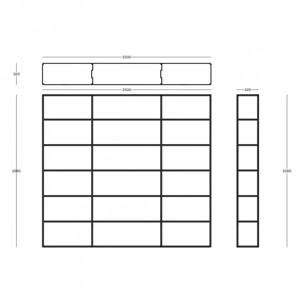 Das Easy Irony Bücherregal 250x32x226cm wird aus Stahl gemacht. Es ist epoxylackiert und hat ein Finish in Sandeffekt. Der Werkstoff Stahl zeichnet sich mit Langlebigkeit aus. Schon während des Fertigungsprozesses werden Reste weiter verarbeitet; das gesamte Regal kann recycelt werden. Ein Gestell aus Vierkantstahlrohr sorgt für stabilen Halt. Es besteht aus vier horizontalen Eckstreben und jeweils zwei Längsstreben an der Vorder- und Rückseite, die das Regal optisch unterteilen. Das Easy Irony Bücherregal 250x32x226cm wird mit sieben Stahlblechbrettern geliefert. Sie werden in Handarbeit in die präzise Form geschnitten. Die Ablagefächer werden im Gestell eingehängt. Durch die Dreiteilung ergeben sich 18 Fächer. Die Regalböden für den mittleren Teil haben eine Breite von 104 cm. Die für die äußeren Seiten sind jeweils 74 cm breit.