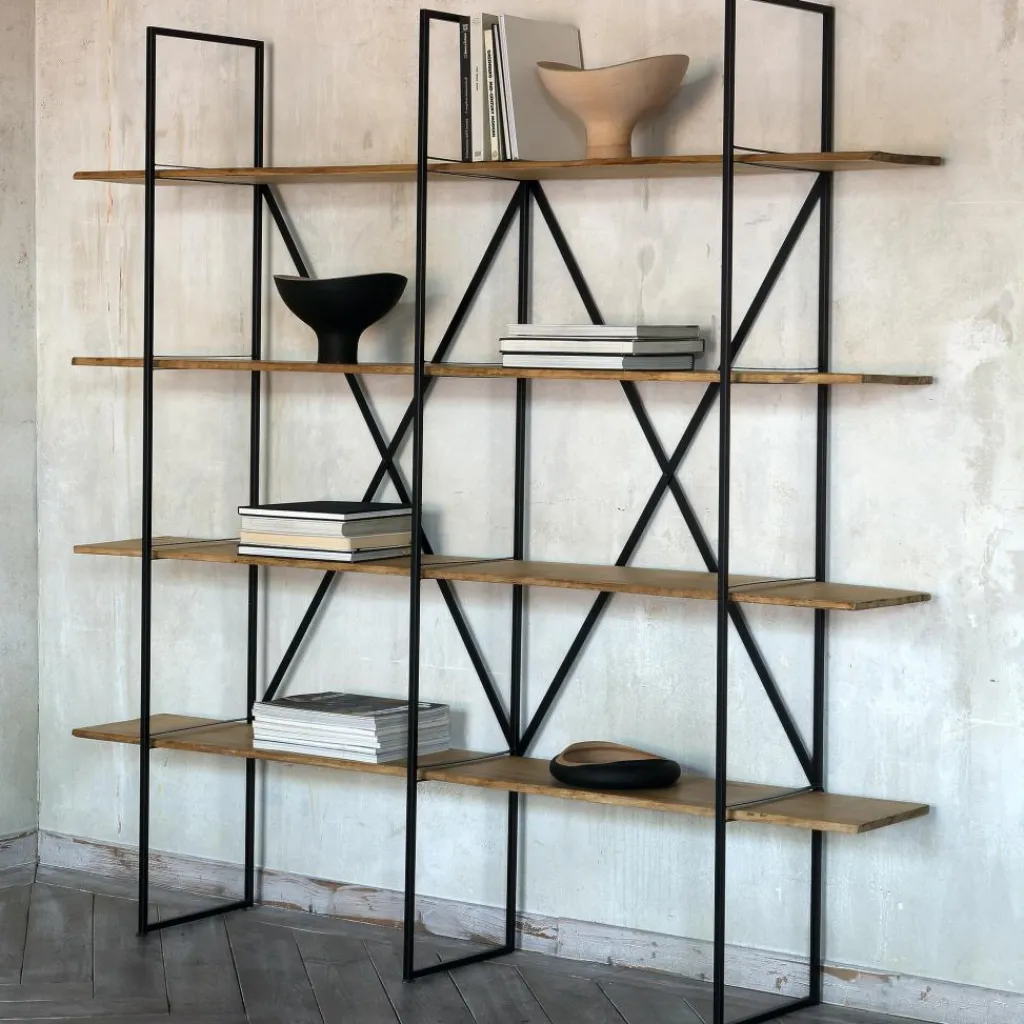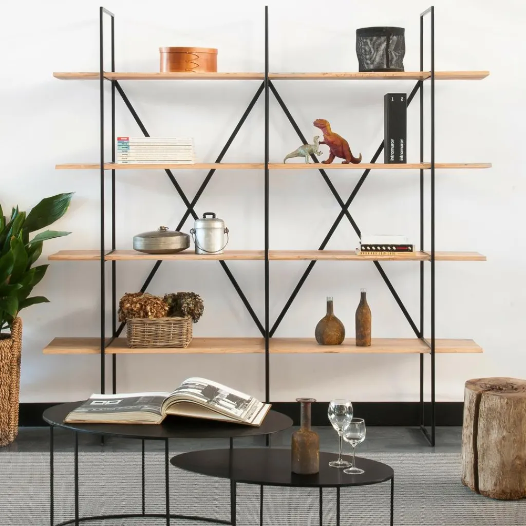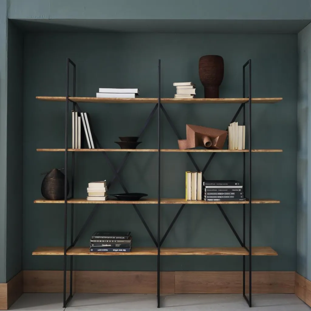 Das Regal besteht aus robustem Vierkantstahlrohr, das eine kupferschwarze Lackierung ziert. Durch die Stützkreuze auf der Rückseite erhält das Regal zusätzliche Stabilität. Das Herzstück bilden natürlich die eleganten Regalböden aus massivem Pappelholz, die über den Rand ragen und zusammen mit dem Gestell eine interessante Symmetrie bilden. Durch die nachträgliche Wachsung ist das Holz gegen Umwelteinflüsse besonders widerstandsfähig. Ebenso besticht der deutliche Kontrast von den Böden und dem dunklen Stahl. Durch das offene Design verdeckt das Regal nicht die dahinter liegende Wand, was die Wohnung nicht kleiner erscheinen lässt, wie es bei geschlossenen Systemen üblicherweise der Fall ist.