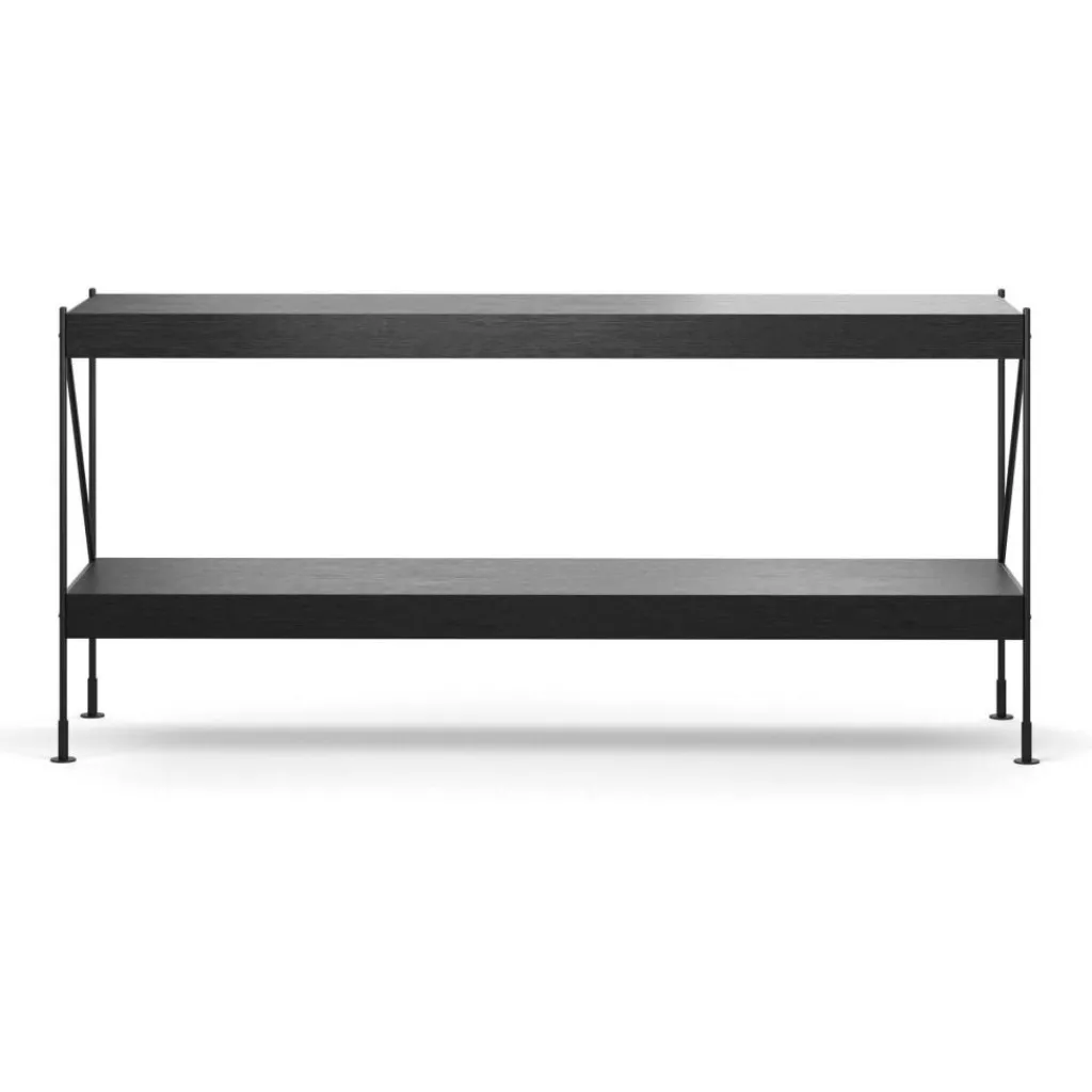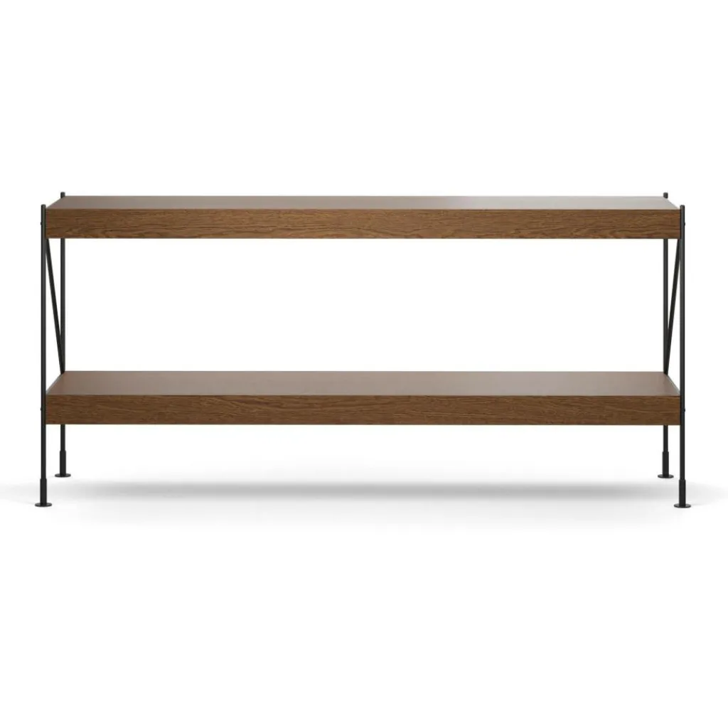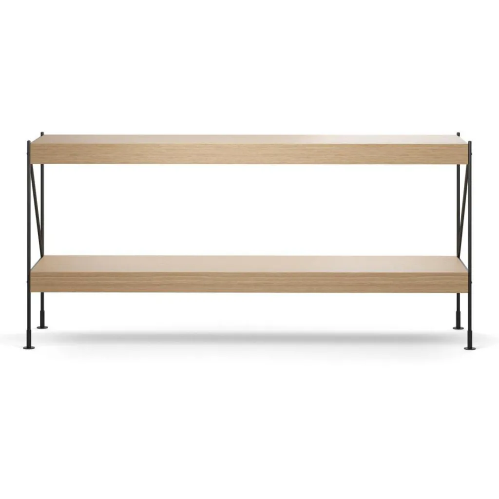 Seinen Namen hat das Zet Storing System Regal H 70cm dem außergewöhnlichen Gestell zu verdanken. Schlanke und in Form des Buchstabens Z angeordnete Metallstreben verleihen dem Aufbewahrungsmöbel seine markante Form. Das Gestell wird aus Stahl hergestellt. Die beiden im Lieferumfang enthaltenen Einlagebretter bestehen aus einer MDF-Platte und sind mit Eichenfurnier überzogen. Sie sind vorne und hinten ein wenig vorgezogen und zeigen im rechten Winkel wie ein Profil nach unten. Praktisch ist, dass man die Einlageböden je nach Belieben versetzen kann. Somit wird das Zet Storing System Regal H 70cm zum vielseitig einsetzbaren Möbelstück. Gerne werden in der Küche darauf Gewürze, Zutaten und Geschirr abgestellt. Im Büro bleiben Schreibmaterial, Aktenordner und andere Gegenstände griffbereit. Auch als Bücher- oder Kleiderregal macht es eine gute Figur.