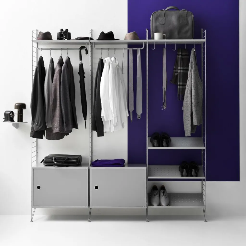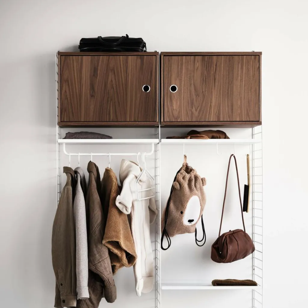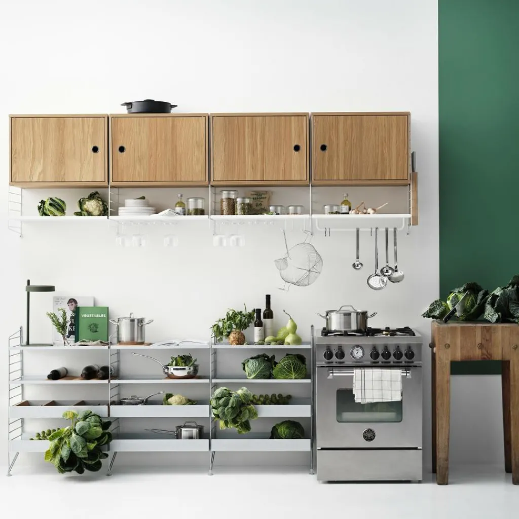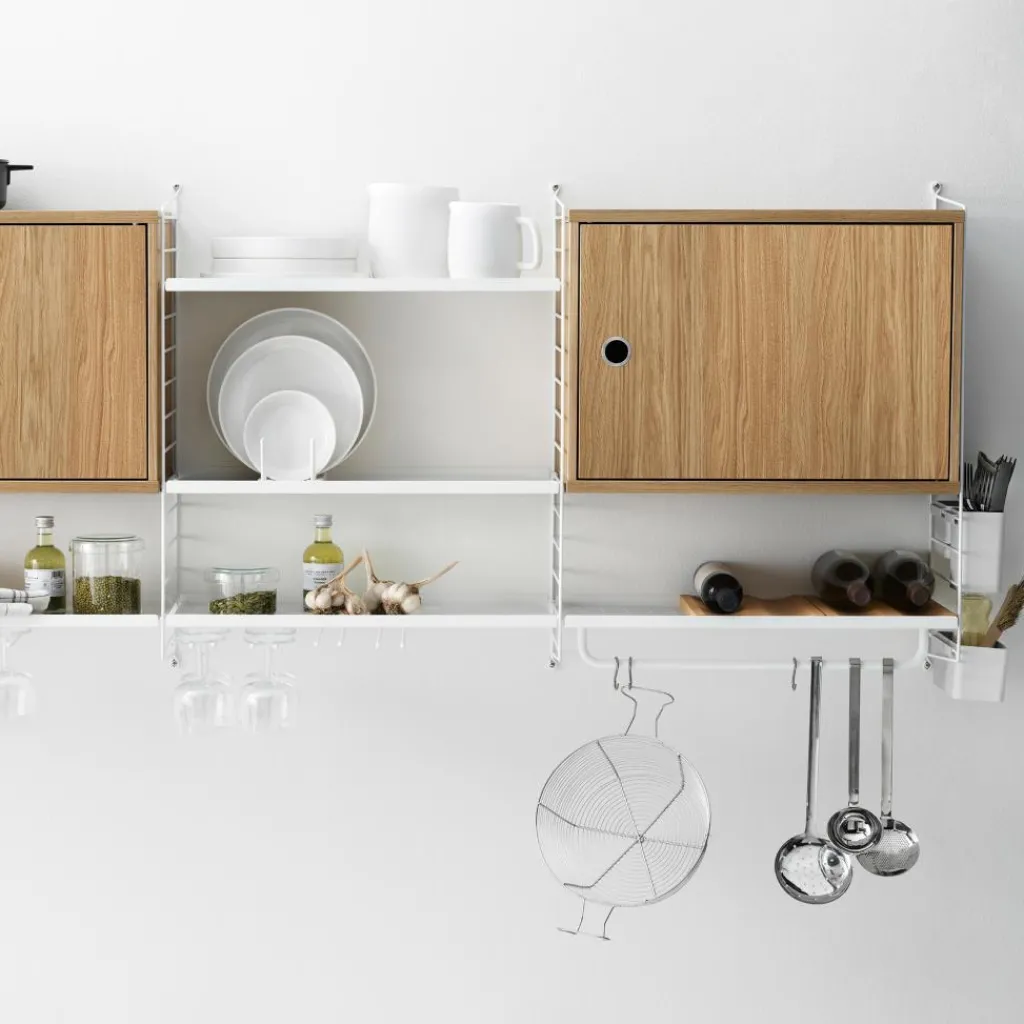 Ursprünglich wird das System aus Stahl gefertigt. Einen interessanten Kontrast zum Rahmen, der zum Teil aus Metallleitern besteht, bildet das String System Schrankelement mit Schwenktür 58x42x30cm. Es besteht nämlich aus Sperrholz oder lackierter MDF in verschiedenen Farben. Hinter der praktischen Schwenktür, die auf beiden Seiten montiert werden kann, verschwinden Bücher und andere Gegenstände. Das String System Schrankelement mit Schwenktür 58x42x30cm ist im Wohn-, Kinder- oder Schlafzimmer ein praktischer und funktioneller Aufbewahrungsort. Es kann jedoch auch im Büro oder Homeoffice verwendet werden.