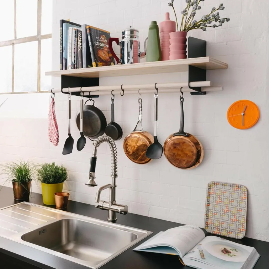 Mit ihrem funktionalen Design, klaren Linien und hochwertigen Materialien verbindet die Atelier Wandgarderobe 100x30x29,5cm Handwerksästhetik mit moderner Wohnkultur – perfekt für den Flur, aber ebenso vielseitig einsetzbar in Küche, Büro oder Atelier. Die stabile Konstruktion wird von farbig pulverbeschichteten Bodenträgern in Basaltgrau RAL-Farbton 7012 getragen. Die Garderobe bietet mit einem offenen Regalboden, einer integrierten Garderobenstange in passendem Holzton und vier passenden Haken, die wie die Bodenträger ebenfalls in Basaltgrau sind, praktischen Stauraum für Jacken, Taschen, Accessoires oder Küchenutensilien. Der Regalboden und die Garderobenstand sind aus massivem Fichten-/Tannenholz oder massiver Eiche gefertigt, dank dieser Materialwahl bringt die Garderobe natürliche Wärme in den Raum. Das Holz ist ein lebendiges Material, das sich im Laufe der Zeit farblich verändert und so eine ganz eigene Patina entwickelt. Ein vorbereitetes Loch ermöglicht die einfache Ergänzung mit einer weiteren Atelier Garderobenstange 100cm, die separat erhältlich ist. Für noch mehr Flexibilität lässt sich die Garderobe außerdem mit dem Atelier Haken 4er Set erweitern.