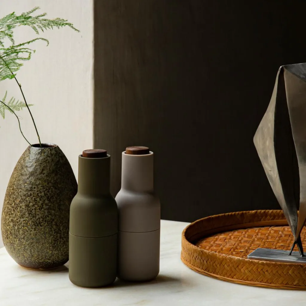 Die Bottle Grinder Mühle 2er Set Deckel Walnuss ist vom Norm Architects Designerteam für die Marke Audo entworfen worden. Mit der Bottle Audo präsentiert sich eine Salz- und Pfeffermühle, die neugierig macht und gleichzeitig fasziniert. Neben ihren augenscheinlichen Qualitäten lag der Fokus auf der praktischen Entwicklung. Das Design der Salz- und Pfeffermühle ist besonders ästhetisch, es stammt von Norm Architects, die maßgefertigte Küchenutensilien für den täglichen Gebrauch entwerfen.