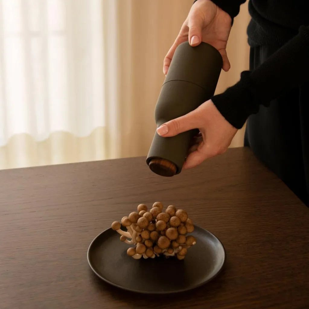 Das „auf- den Kopf-gestellte“ Design trägt dafür Sorge, dass Pfeffer und Salz nur dann herausgestreut werden können, wenn die Mühle umgedreht wird. Hält man die Mühle hingegen aufrecht, verbleiben Salz und Pfeffer im Behälter.