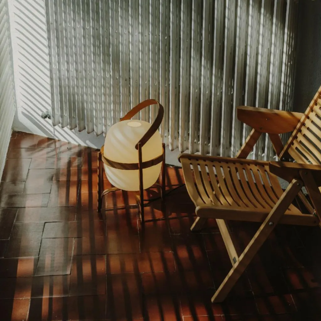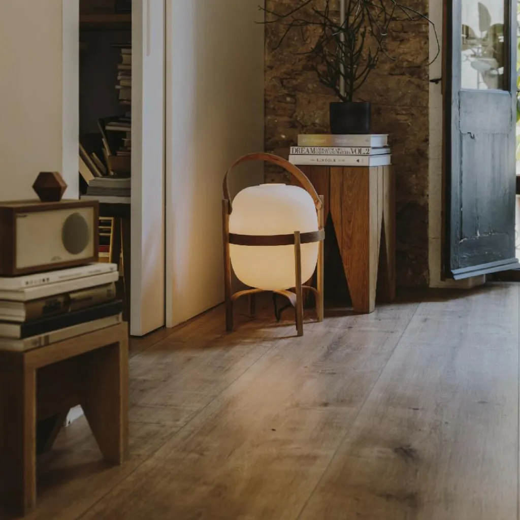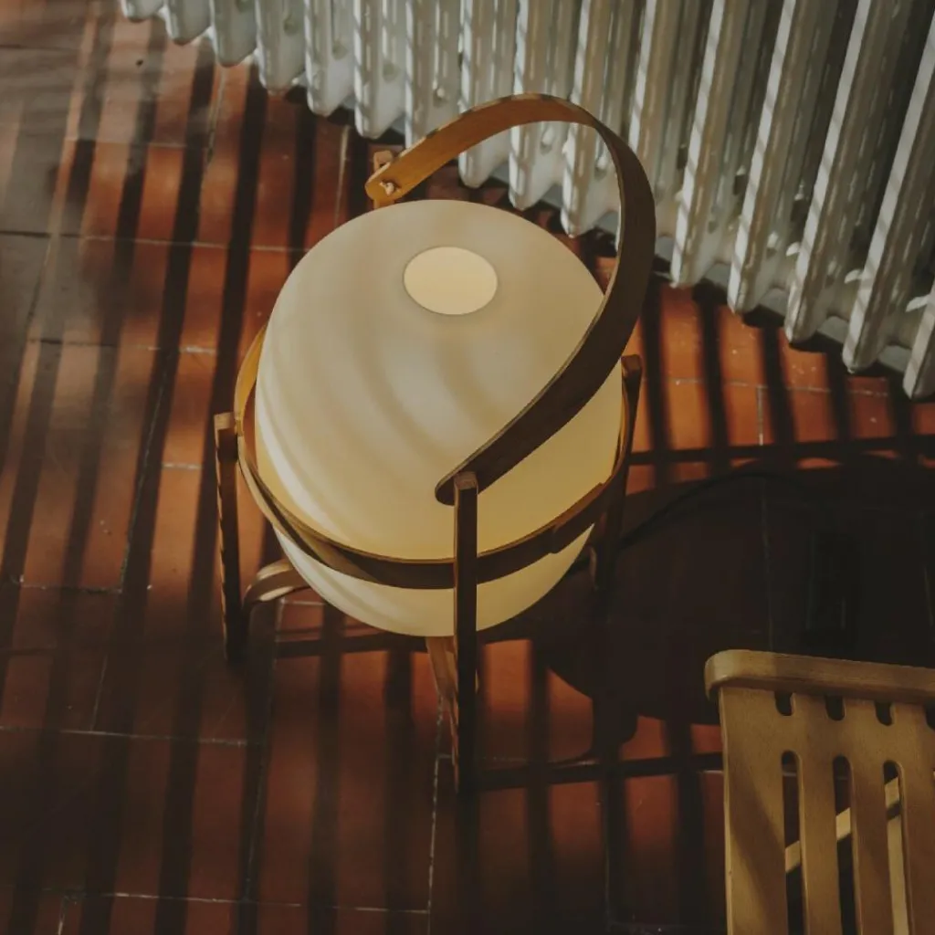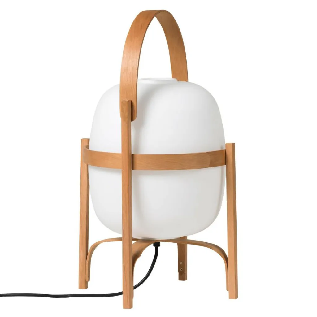 Im Inneren der Cesta Tischleuchte befindet sich ein ovaler Leuchtball aus opalweißem Glas – das sorgt für ein diffuses, weiches Licht. Ein Dimmer regelt die Lichtstärke. Gehalten wird die Leuchte von einem Gestell mit Henkel aus Kirschholz, was der Cesta Tischleuchte einen Hauch Asia Flair verleiht.