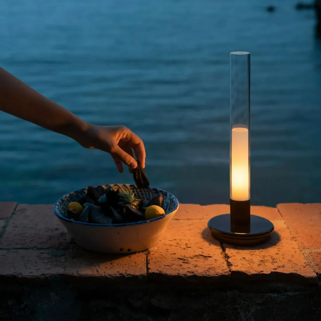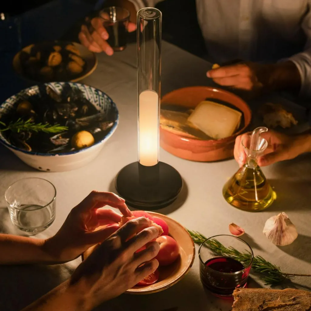 Die Sylvestrina LED Akkuleuchte wurde von Jordi Garcés und Enric Sòria für die Marke Santa & Cole entworfen. Benannt wurde die Leuchte nach einem urigen Fischer aus El Brot de la Selva. Inspiration fanden die Designer in traditionellen Ölleuchten, die schon vor Jahrhunderten Licht spendeten.
