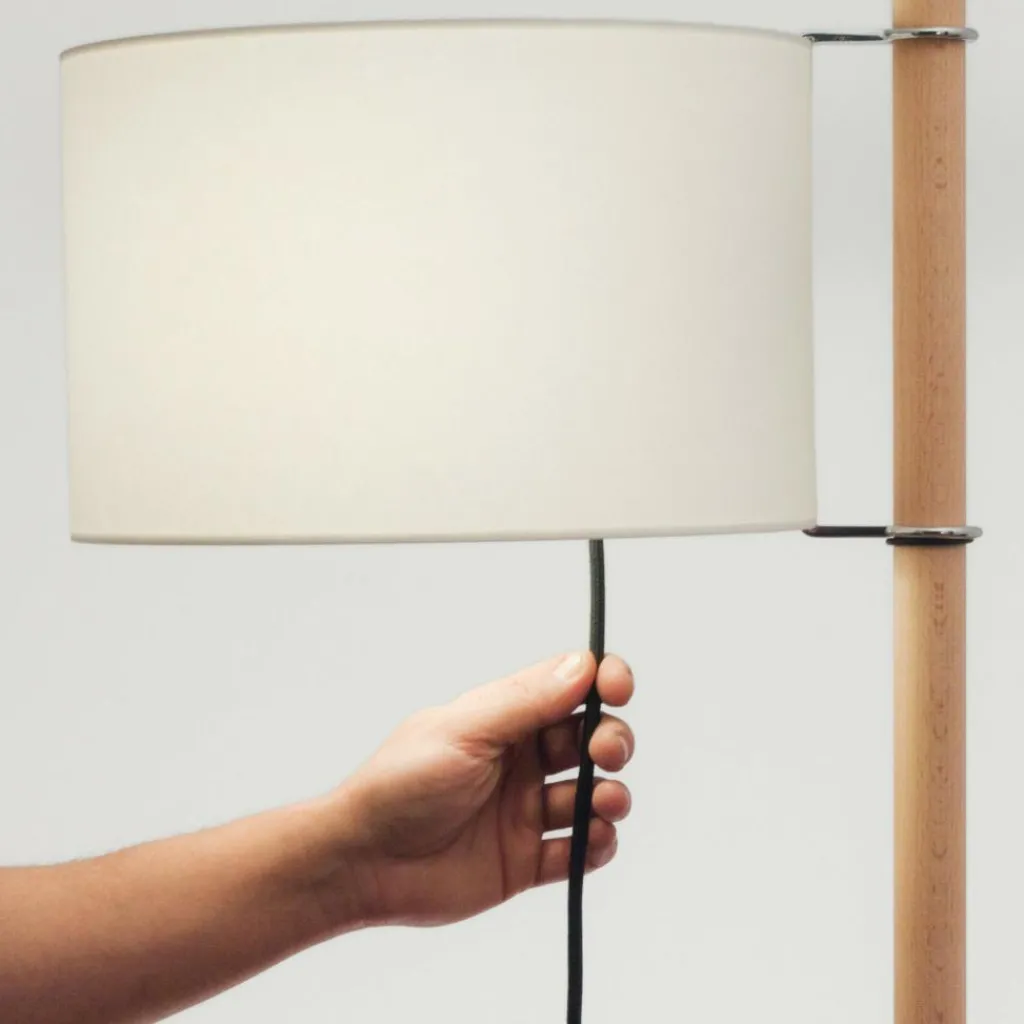 Auf dem schlichten Fußkreuz steht ein Holzständer, der mit 166 cm eine beachtliche Höhe besitzt. An ihm ist der Lampenschirm befestigt. Unten ist der Ständer breiter als oben – eine gut durchdachte Konstruktion. Denn so ist es möglich, den Lampenschirm in der Höhe zu verstellen. Dazu umfasst man den Ringhalter aus Metall, an dem der Schirm befestigt ist, und schiebt ihn leicht nach oben oder unten, je nachdem, in welcher Sitz- oder Liegeposition man gerade ist. Um das Licht auszuschalten, nimmt man das Kabel in die Hand und durch sanften Zug wird es dunkel. Das Einschalten funktioniert natürlich genauso.