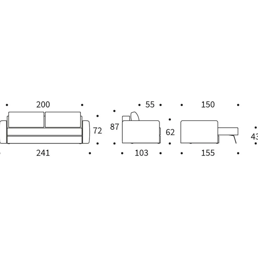 | Abmessungen | Breite: 241cm Höhe: 87cm Tiefe: 103cm Sitzhöhe: 43cm Höhe Armlehne: 72cm Höhe Liegefläche: 43cm |