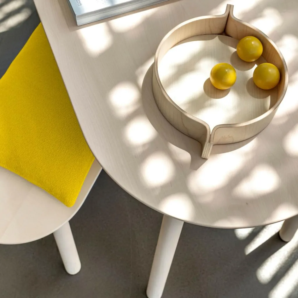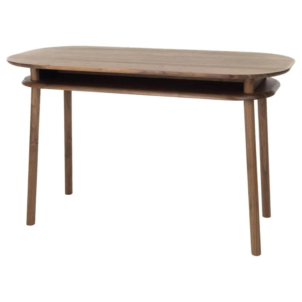 Der Bureau Schreibtisch wird ganz den Ansprüchen modernen Wohnens gerecht. Er vereint Sinn für Ästhetik und Funktionalität. Mit seinen harmonisch gerundeten Ecken verbreitet er in jedem Raum wohnliche Atmosphäre. Der Bureau Schreibtisch eignet sich für das Büro oder Homeoffice, kann jedoch auch als Esstisch verwendet werden. Sicheren Stand gewährleistet das Gestell aus massivem Holz, wahlweise Nussbaum, Ahorn oder Buche. Unter der Tischplatte ist eine Ablagefläche montiert. Darauf lassen sich Büromaterial, nicht verwendete Laptops oder Tablets und viele weitere Gegenstände ablegen. Der Bureau Schreibtisch ist in verschiedenen Farben zu haben. Die Oberfläche besteht aus MDF, einer pflegeleichten Holzfaserplatte. Praktisch sind die beiden Steckdosen, die sich im Ablagefach vorne und hinten befinden. Somit können Kabel unsichtbar an den Stromkreis angeschlossen werden.