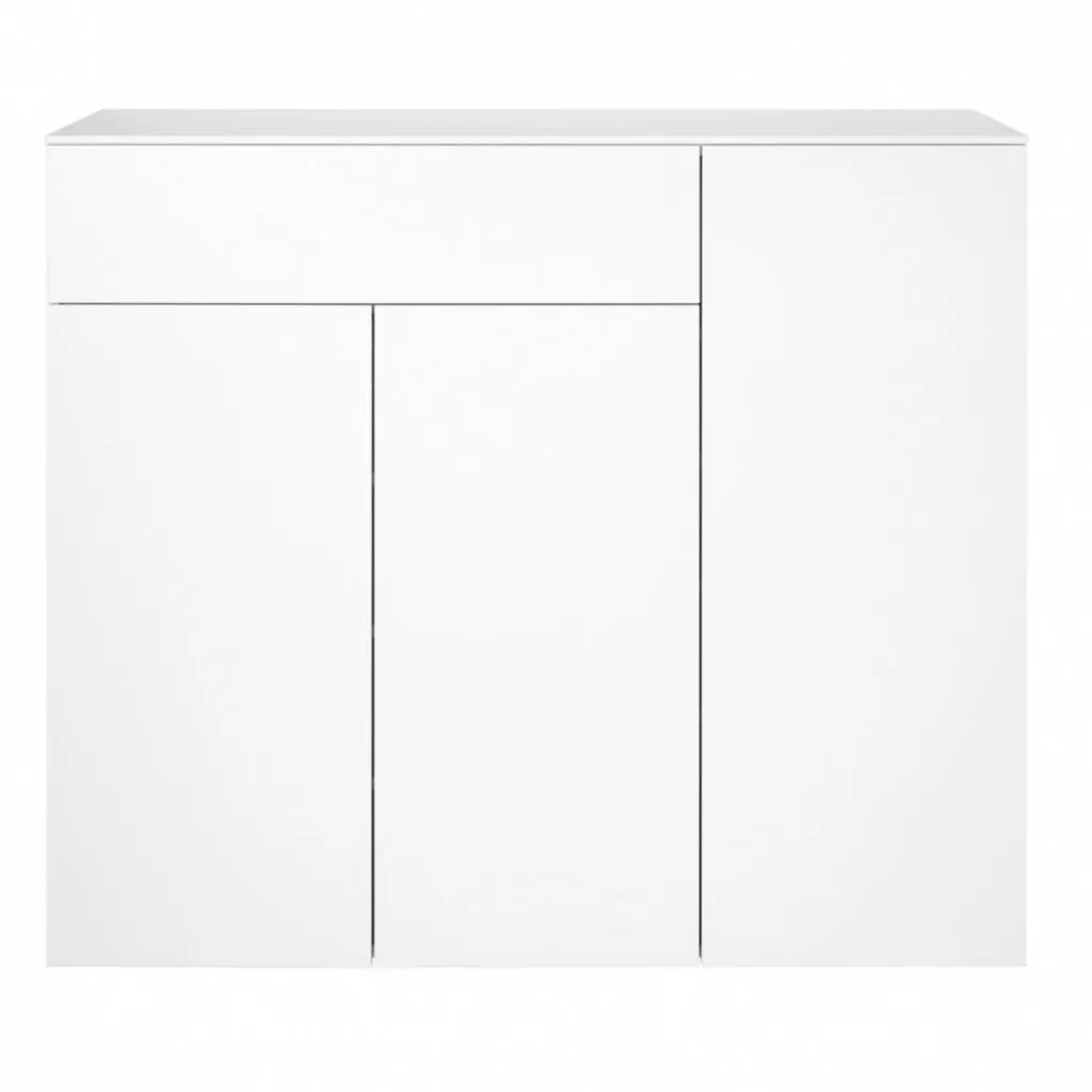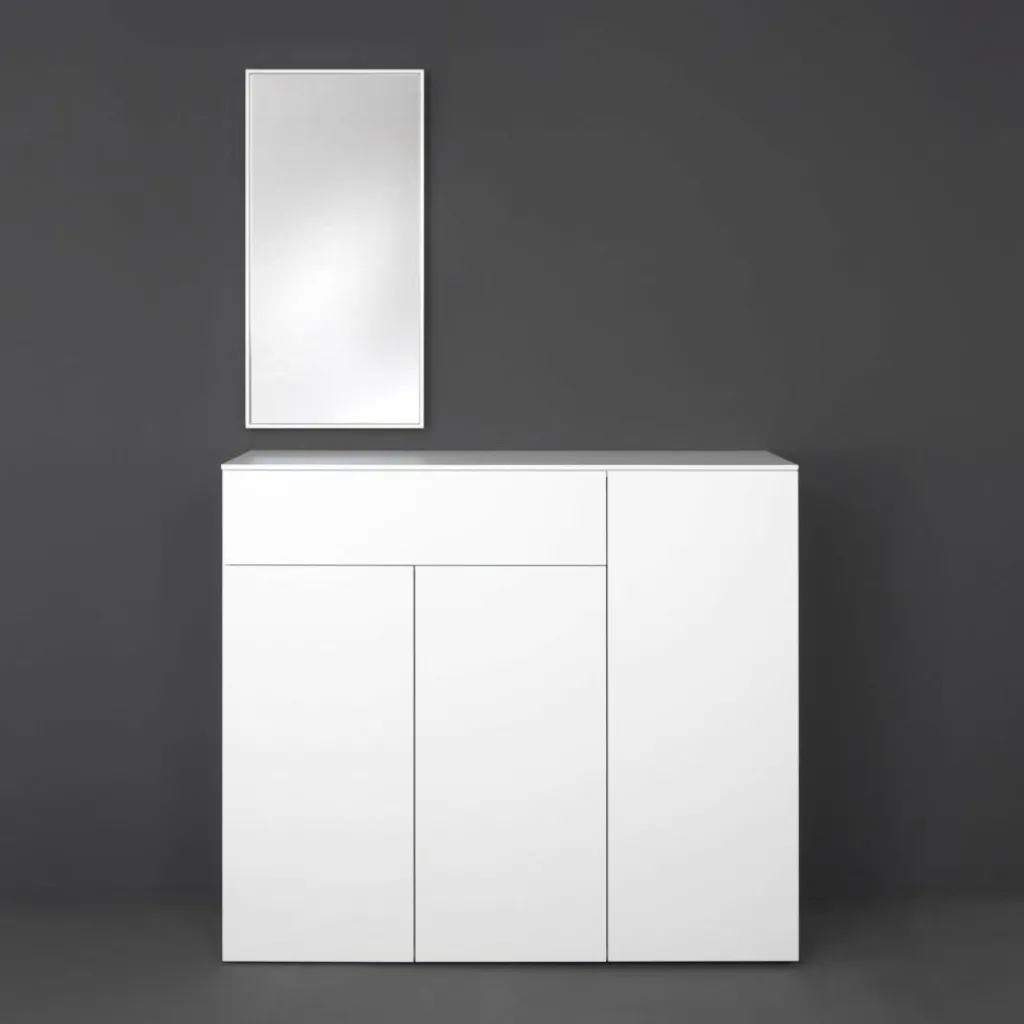 Das solide verarbeitete Möbelstück ist schneeweiß lackiert, die Füße sind pulverbeschichtet. Es ist 1,04 m hoch und misst in der Breite 1,20 m. Mit einer Tiefe von 39,1 cm stellt es reichlich Stauraum zur Verfügung. Zusätzliche Lochblech-Schuhböden können als Zubehör gewählt werden, genauso wie Fachböden unterschiedlicher Längen. Damit kann man die Kommode ganz nach seinen eigenen Wünschen individualisieren. Außerdem gibt es für die Urban 1074 Kommode mit Schuhablage auch ein Untergestell, das die Kommode auf Füße stellt und sie um ganze 12 cm wachsen lässt. Wer statt des Schubkastens lieber drei gleich große Türen möchte, entscheidet sich für die Version Urban 1073. Alle Teile der Kommode werden in Bad Königshofen in Bayern produziert, so wie beinahe das komplette Sortiment des deutschen Herstellers. Die Urban-Serie umfasst neben den praktischen Bodenkommoden auch eine schicke Truhe, einen dekorativen Wandspiegel und eine Wandkommode.