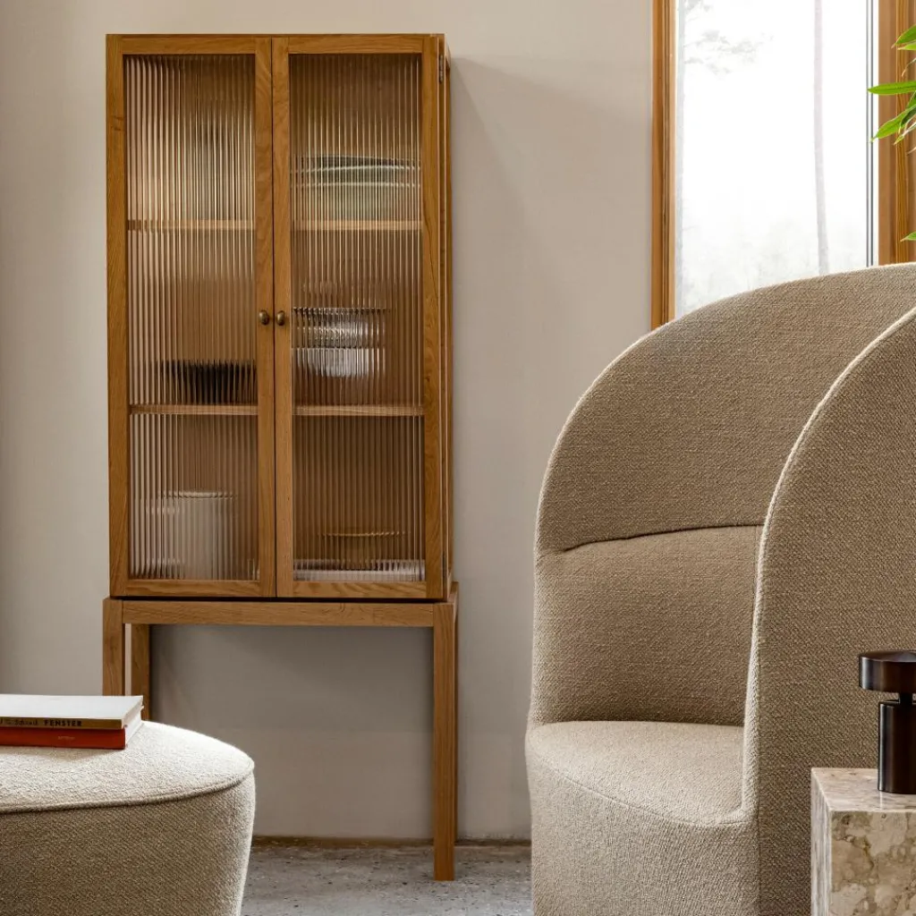 Die Curiosity Vitrine H 168 cm wurde von Mathias Mentze und Alexander Ottenstein für die Marke Audo entworfen. Der Name bedeutet auf Deutsch übersetzt so viel wie Neugierde. Gemeint ist damit, dass die in der Curiosity Vitrine H 168 cm aufbewahrten Gegenstände als Silhouette erkennbar sind, da die Türen semitransparent sind.