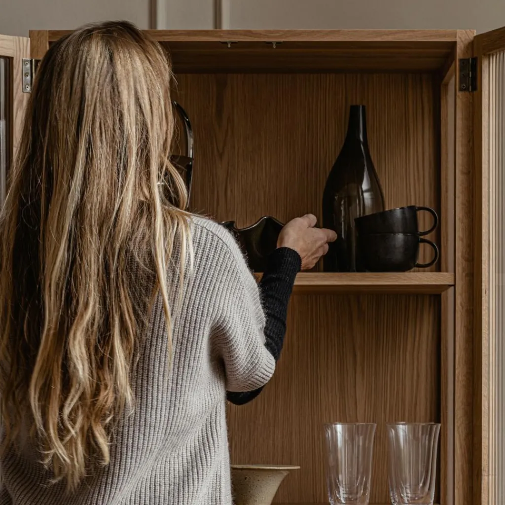 Bei der Curiosity Vitrine H 168 cm spielen die Designer mit kontrastreichem Material. Das Gestell ist aus massivem Eichenholz hergestellt. Es besteht aus vier gerade geschnittenen Füßen und dem Rahmen für den Korpus. Die beiden Türen werden mit Knöpfen aus Messing geöffnet und wieder geschlossen. Die Rückwand besteht aus MDF im selben Ton wie das Gestell. Die Seitenwände und Türen bestehen aus geriffeltem Glas. Durch sie wirkt die Curiosity Vitrine H 168 cm hell und luftig. Zwei Einlegebretter sorgen in der Curiosity Vitrine H 168 cm für Ordnung.